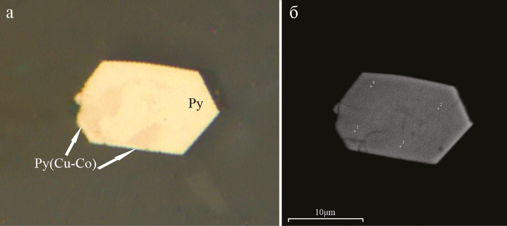 8 | 1 | 55.58 | 39.73 | 1.65 | 3.77 | – | – | – | – | – | 100.73 | Co-Cu-содержаший пирит | (Fe0.85Cu0.07Co0.03)0.95S2.05 | 13-3/316.5 |