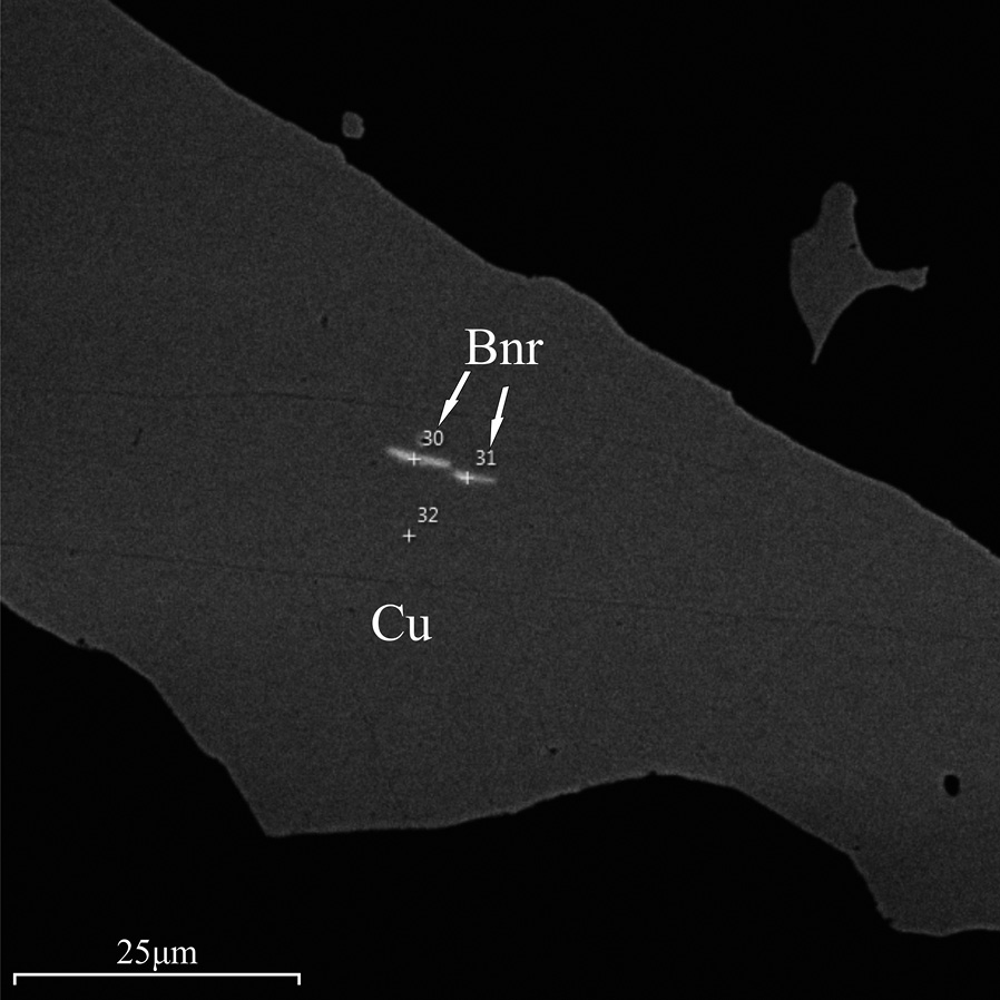 Рис. 12. Пластинки браннерита (Bnr) внутри зерна самородной меди (Cu).
