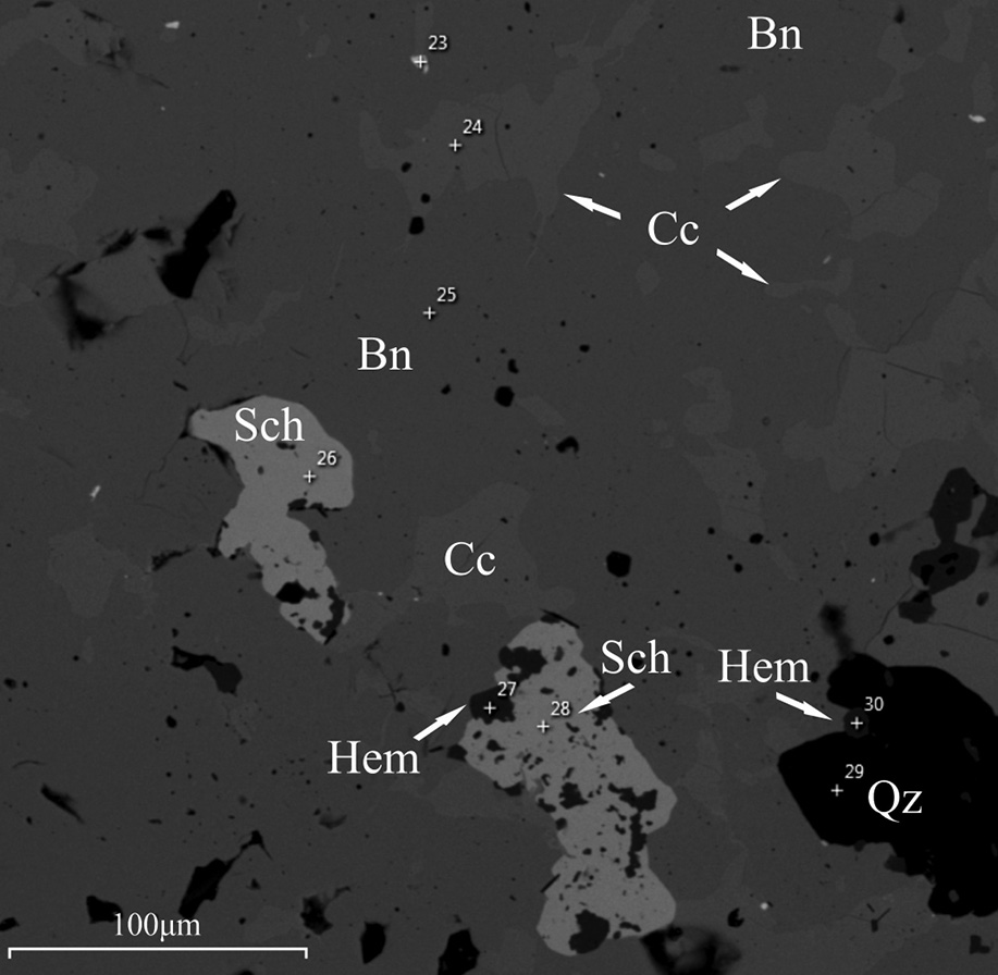 Fig. 13. Intergrowths of scheelite (Sch) and hematite (Hem) in bornite (Bn)-chalcocite (Cc) veinlet.