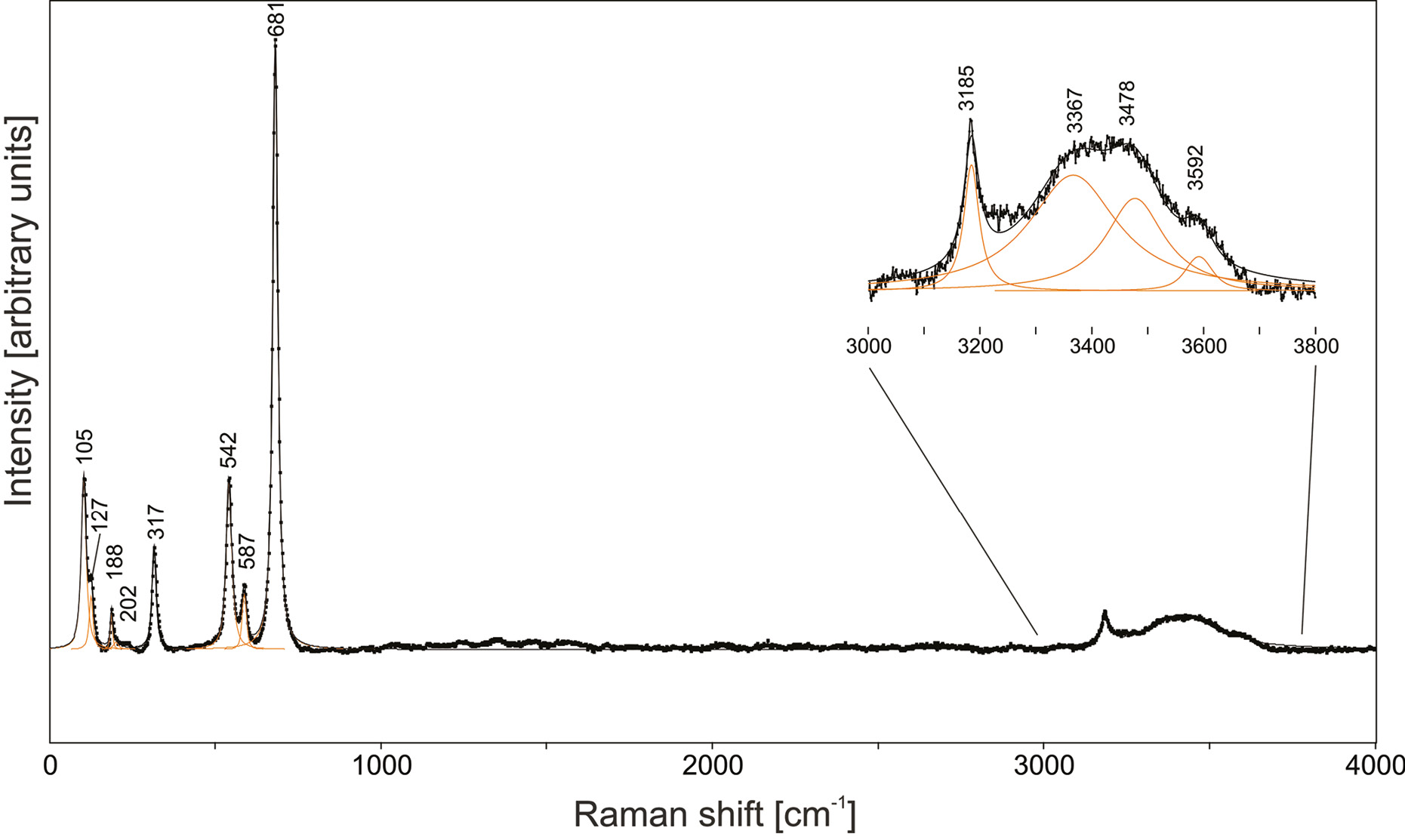 A Raman spectrum of gajardoite-(NH4) (Fig. 5) was registered on a Horiba Labram HR Evolution spectrometer. This dispersive edge-filter-based system is equipped with an Olympus BX 41 optical microscope, a diffraction grating with 600 groove/mm, and a Peltier-cooled Si-based charge-coupled device (CCD) detector. The Raman signal was excited by a 532-nm laser. A nominal laser beam energy of 50 mW was attenuated to 5 % using a neutral density filter to avoid the thermal damage of the analytical area. The Raman signal was collected in a range of 100– 4000 cm–1 with a 100´ objective. The system was operated in a confocal mode, at a beam diameter of ~2.6 mm,an axial resolution of ~5 mm, a time acquisiti-on of 120 s per spectral frame, and 10 accumulations. The wavenumbers were calibrated using the Rayleigh line and low-pressure Ne-lamp emissions. A wavenumber accuracy was ~0.5 cm–1 and a spectral resolution was ~2 cm–1. Band fitting was applied after appropriate background correction assuming combined Lorentzian-Gaussian band shapes using a Voight function (PeakFit; Jandel Scientific Software).