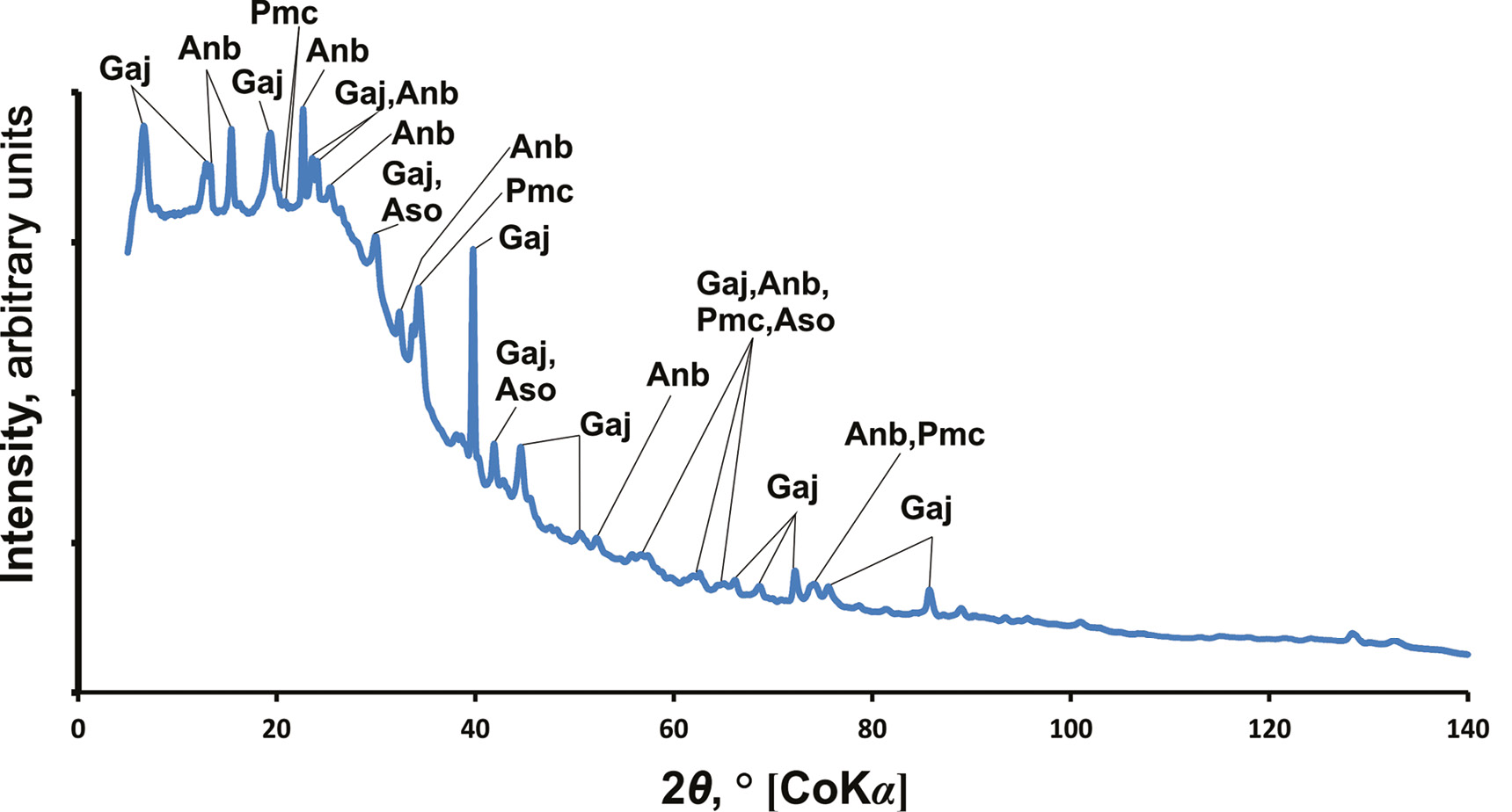 Gaj – gajardoite-(NH4); Anb – annabergite; Aso – arsenolite; Pmc – pharmacolite. The phase distribution is given only for the intense peaks for clarity.