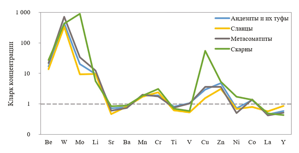 В метасоматитах наблюдаются самые высокие концентрации W и, в меньшей степени, Mo и Li. Выше кларковых концентрации Zn, Cu, Mn и Co, ниже кларковых – Ni, Ti, La, Y, Ba и Sr (рис. 4). Распределение Ti, V и Y равномерное. Остальные редкие элементы распределены неравномерно, а W, Cu и Zn – крайне неравномерно (табл. 2).