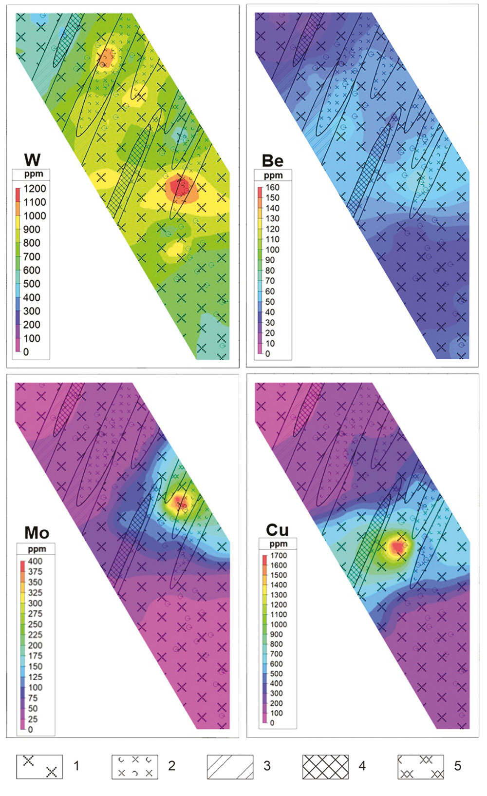 Рис. 5. Схемы распределений средних содержаний W, Be, Mo и Cu (г/т). Уровень среза +30 м. 1 – андезиты; 2 – туфы андезитов; 3 – сланцы; 4 – метасоматиты; 5 – скарны.
