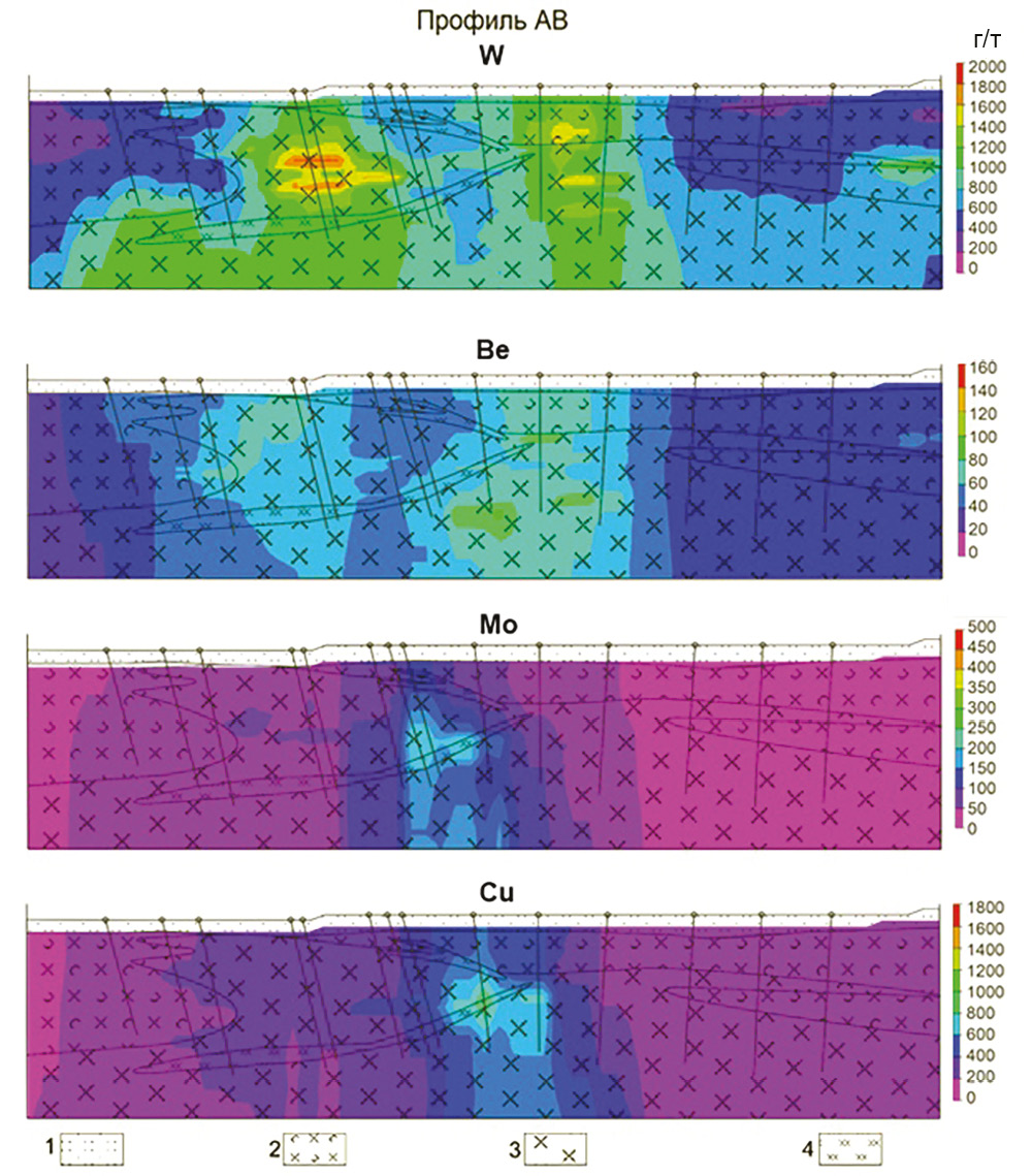 Рис. 6. Распределение содержаний W, Mo, Be и Cu по профилю АВ (г/т). 1 – кора выветривания; 2 – туфы андезитов; 3 – андезиты; 4 – скарны.