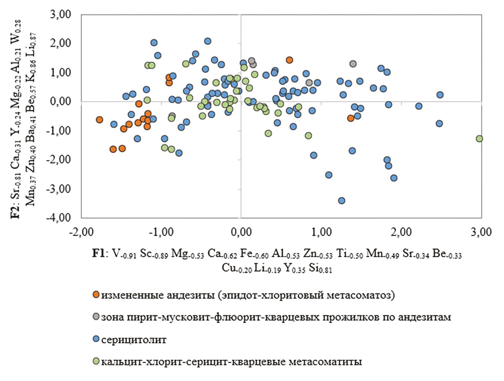 Для метасоматитов изменчивость распределения химических элементов описывают три фактора (R = 0.16) (табл. 4). На фактор 1 наибольшее положительное влияние оказывают Si и Y, отрицательное – Mg, V и Sc. Незначимо влияют K, Ba, Cr и W. На фактор 2 наибольшее положительное влияние оказывают K и Li, отрицательное – Sr. На фактор 3 наибольшее положительное влияние оказывает W и Ca, отрицательное – Ba, Al и Ti. На графике значений фактора 1 и фактора 2 фигуративные точки частных проб разделяются по минеральному составу: в область положительных значений фактора 1 попадают серицитовые метасоматиты, а в область отрицательных значений – хлорит-эпидотовые метасоматиты. В положительной области фактора 2 на диаграмме находятся точки метасоматитов с пирит-мусковит-флюорит-кварцевыми прожилками, а в отрицательной – хлорит-эпидотовых пород без мусковита (рис. 9).