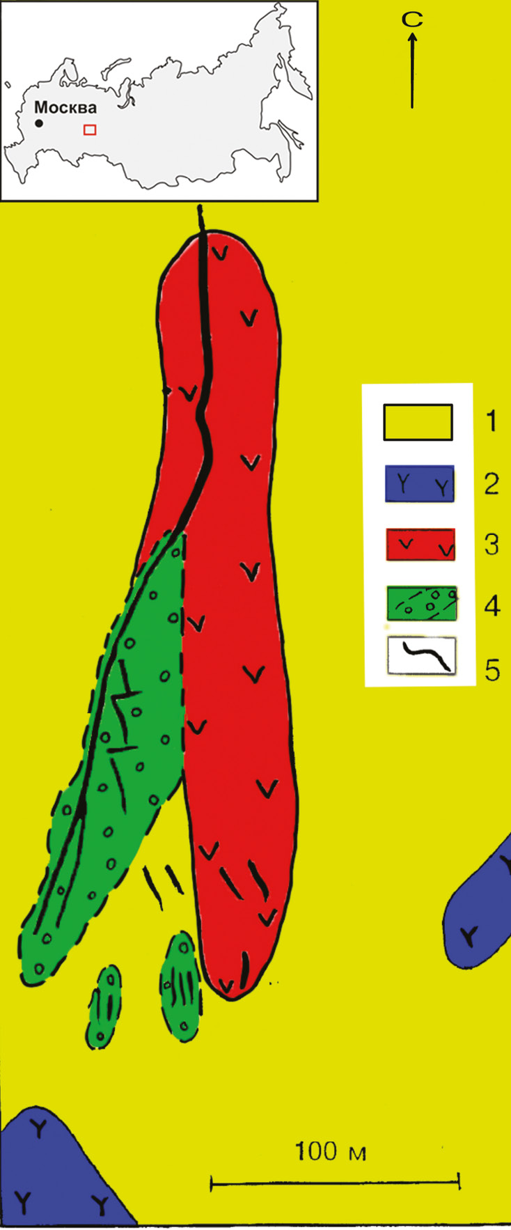 Рис. 1. Геологическая схема золото-кварцевого месторождения Приозёрное, по (Мурзин, 1997) с изменениями.