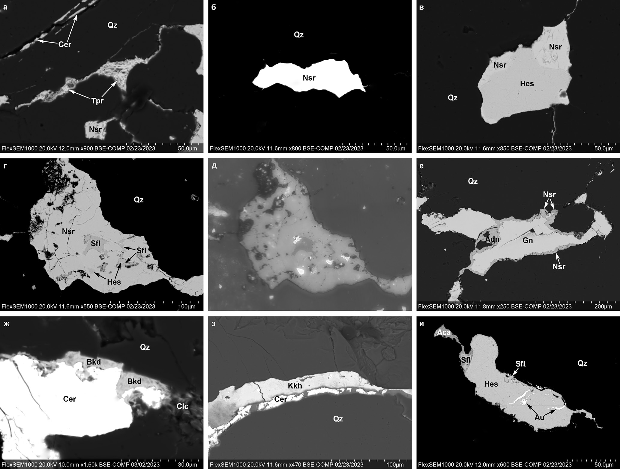 а – telluroperite veinlet in quartz in assemblage with northstarite (Nsr) and cerussite (Cer); б – northstarite grain in quartz; в – partial pseudomorphosis of northstarite after hessite in quartz; г – northstarite and schieffelinite (Sfl) aggregate with hessite relics in quartz; д – the same aggregate in reflected light; е – northstarite rim and adanite (Adn) grain after galena (Gn) in quartz; ж – burckhardtite (Bkd) rim on cerussite veinlet with clinochlore (Clc) in quartz; з – kuranakhite (Kkh) and cerussite veinlet in quartz; и – schieffelinite grains replacing hessite with native gold and acanthite (Aca) in quartz.