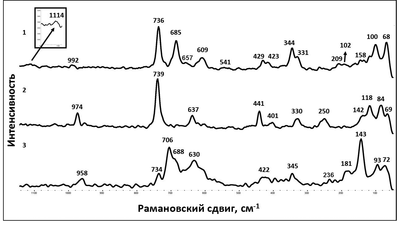 Шиффелинит – единственный из изученных нами минералов Те, имеющий в составе воду, причем как молекулярную, так и в виде OH-групп. Из-за сильной люминесценции подтвердить их присутствие с помощью КР спектроскопии не удалось, поэтому приведенный спектр (рис. 6-3), как и в случае с безводными минералами, ограничен диапазоном 50–1200 см–1. Тем не менее, в указанной области он сходен с КР спектром проверенного монокристальным рентгеновским методом шиффелинита из рудного района Томбстоун, Аризона (образец из базы данных RRUFF № R140572) как по интенсивности рамановских полос, так и по их частотам. В КР спектрах теллуратов валентные колебания связей Te–O обычно немного сдвинуты в более низкочастотную область по сравнению с теллуритами (Missen et al., 2019; Kampf et al., 2020a; 2023), поэтому сильные полосы при 706 и 630 см–1 интерпретируются соответственно как симметричные и ассиметричные валентные моды анионов TeO42–. Вторая из этих полос, кроме того, маскирует деформационные колебания сульфат-ионов. Полосы при 422 и 345 см–1 относятся к деформационным колебаниям анионов TeO42-. Слабые полосы при 236 и 181 см–1 интерпретируются как валентные колебания связей Pb–O, а полосы в более низком диапазоне (в частности, сильная полоса при 143 см–1) – как деформационные колебания связей Pb–O–Pb, а также решеточные моды. Полоса при 958 см–1 является главным индикатором присутствия сульфатных групп в минерале: она соответствует симметричным валентным колебаниям анионов SO42–. Полосы при 688 и 734 см–1, вероятнее всего, связаны с небольшой примесью нортстарита, вмещающего зерно шиффелинита, на котором регистрировался КР спектр (рис. 4г).