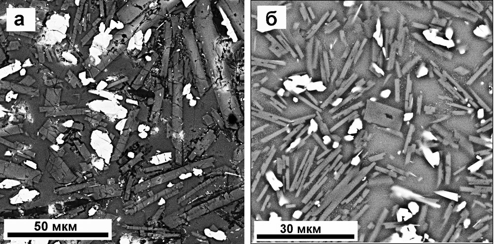 Рис. 3. Основная масса в андезите (а) и даците (б).