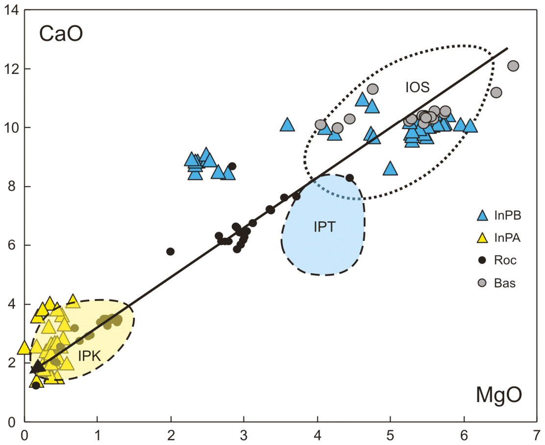 По соотношению CaO–MgO стекла прогретых расплавных включений в исследованных плагиоклазах формируют две группы, связанные трендом эволюции составов эффузивов. Компактную группу с минимальными содержаниями CaO и MgO образуют, совместно с соответствующими эффузивами, расплавные включения в плагиоклазе из андезитов и дацитов, располагающиеся в поле природно-закаленных стекол из включений в плагиоклазе из андезитов вулкана Меньший Брат (рис. 12). В группу с повышенными содержаниями CaO и MgO входят составы стекол прогретых включений в плагиоклазе из базальтов вулкана Локон, большая часть которых, совместно с составами базальтов этого района, располагается в поле природно-закаленных стекол из включений в минералах из эффузивов вулкана Сопутан (рис. 12).