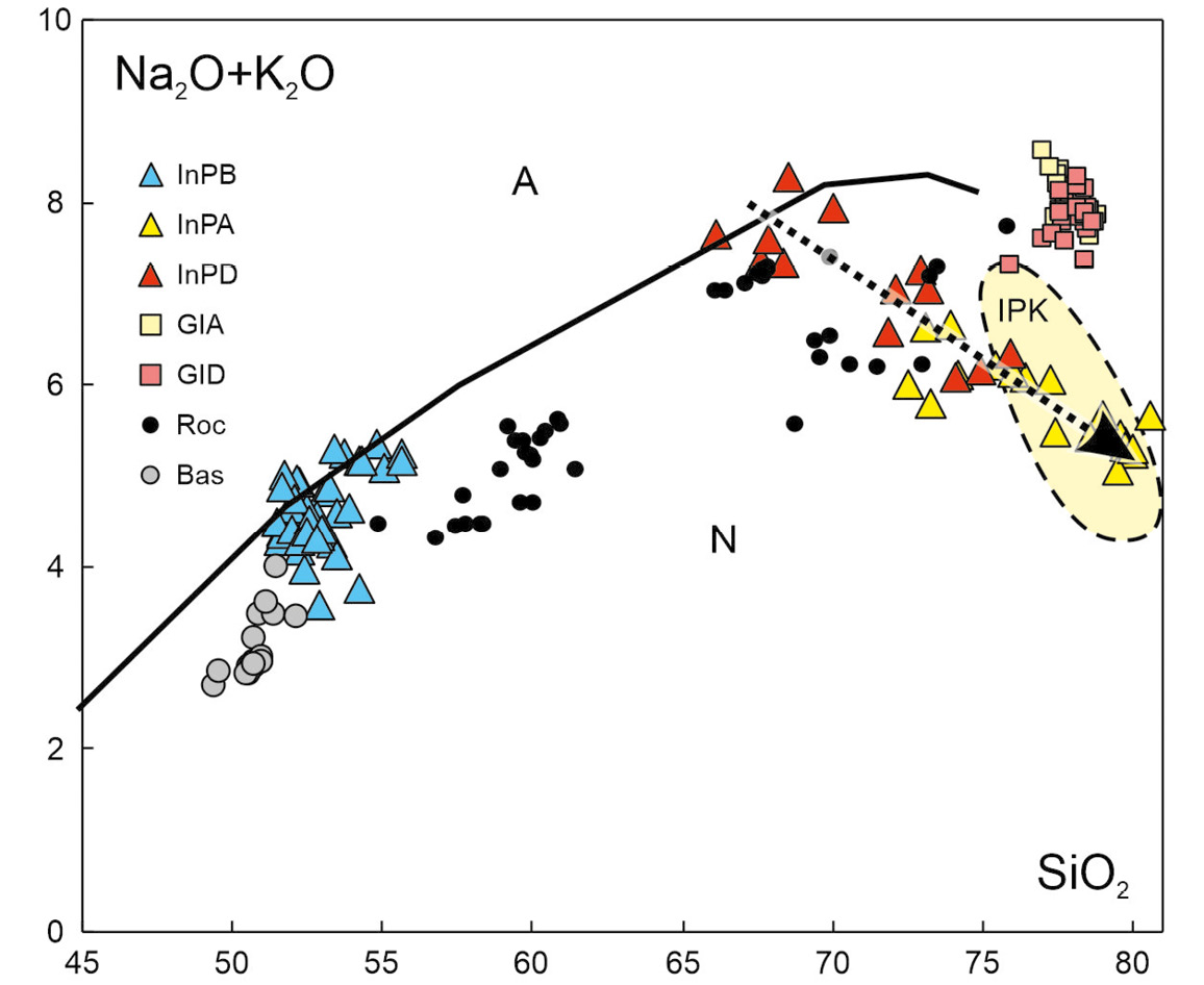 Области щелочных (A) и нормальных (N) пород. Рисунок построен на основе оригинальных данных с использованием материалов из работ (Петрографический..., 2009; Kushendratno et al., 2012; Kunrat, 2017; Низаметдинов, 2022).