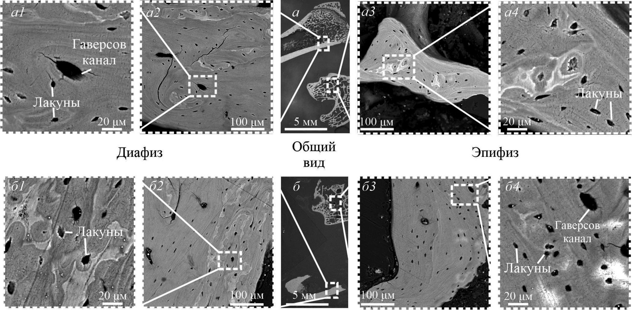 В продольном спиле кости наблюдаются лакуны: костные полости, в которых размещаются остеоциты (рис. 2). Гаверсова система в данном сечении не различима, как и спайные линии. Структурно-морфологический рисунок кости хорошо читается в режиме обратно-отраженных электронов, обеспечивающим выделение контрастных зон в оттенках серого. Более темные участки расположены ближе к костным лакунам, светлые – наиболее удалены от них (рис. 2 а2, а3, б2, б3). Размер лакун в костной ткани здоровой особи в эпифизе составляет 6–11 мкм, в диафизе – 8–11 мкм, примерный размер гаверсовых каналов, которые представлены под угловым спилом составляет ~30 мкм (рис. 2 а1, а4). В патогенно измененной костной ткани размер лакун в эпифизе составляет 6–11 и ~14 мкм в диафизе (рис. 2 б1, б4).