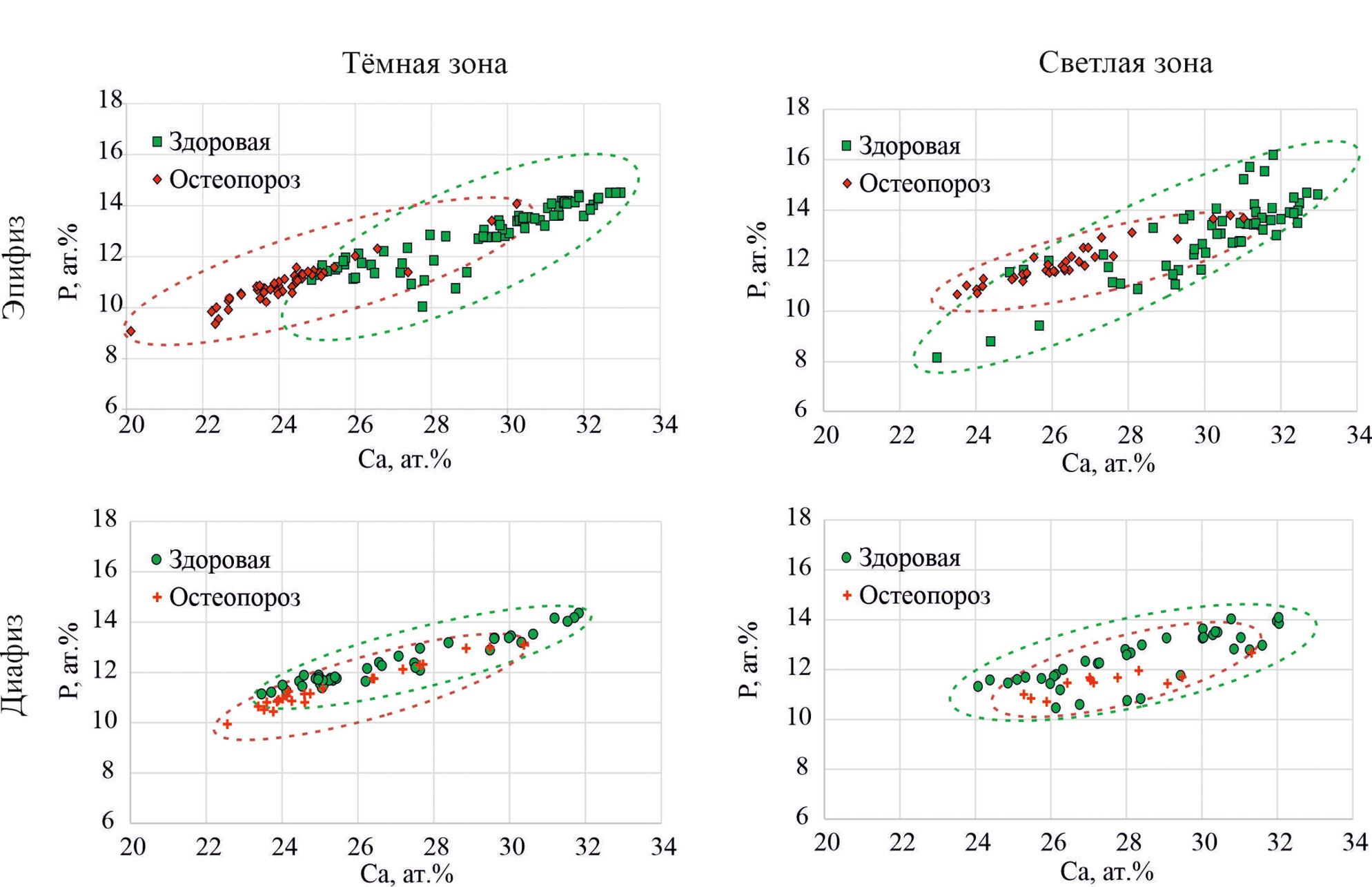 Бинарные диаграммы распределения содержания видообразующих элементов (Ca, P) показали прямую положительную зависимость между этими компонентами. Коэффициент связи между элементами варьирует от 0.8 до 0.9 (рис. 3). Эта зависимость характерна для всех выделенных типов костей (по состоянию здоровья, по типу костной ткани, по структурно-текстурному рисунку). Однако в гидроксилапатите эпифиза кости, пораженной остеопорозом, концентрации и P, и Ca меньше, чем в кости здоровой особи. Особенностью содержания видообразующих элементов гидроксилапатита диафиза светлых и темных участков является повышенное содержание P в образцах здоровой кости.