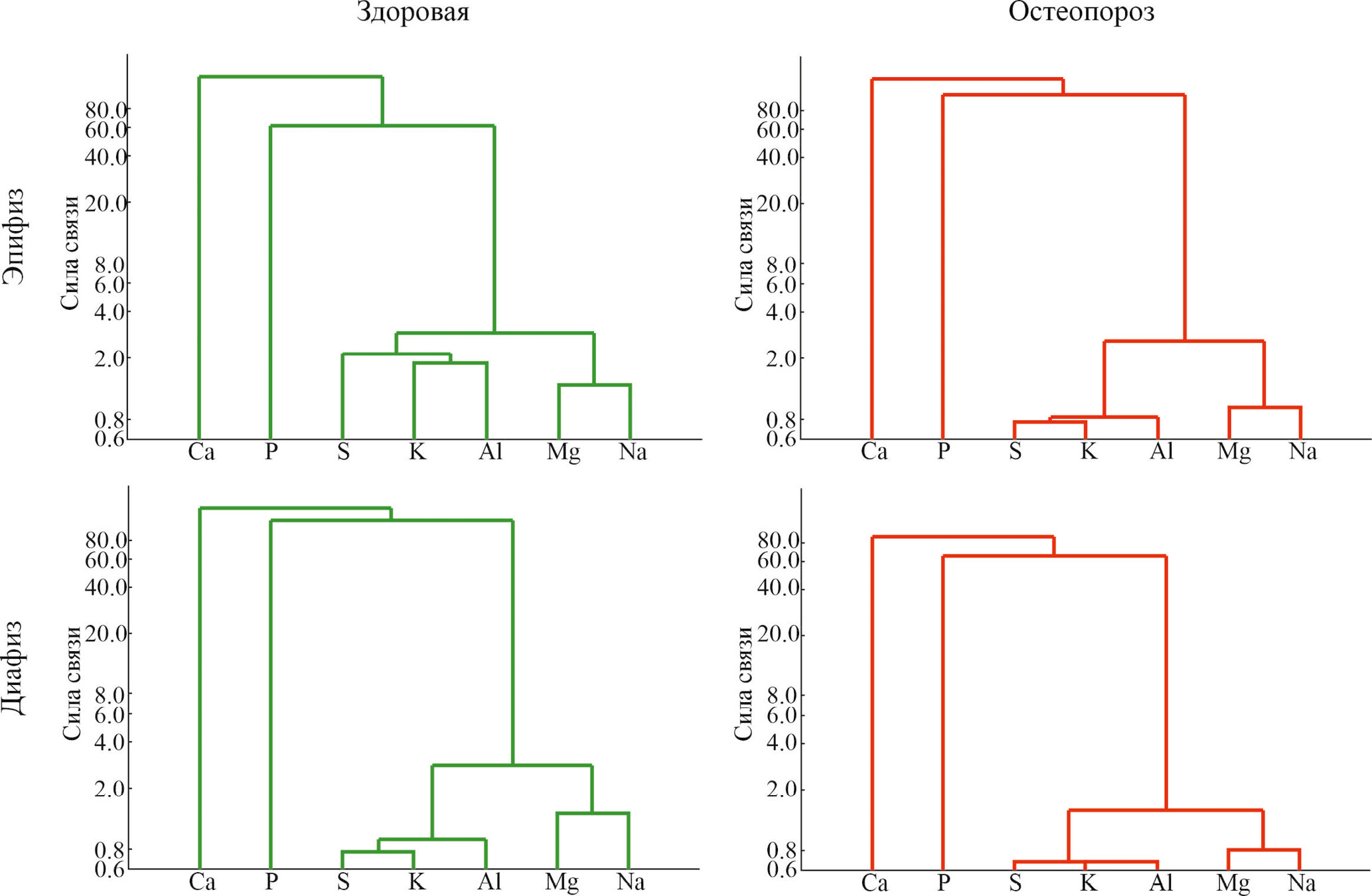Для всех рассмотренных выборок отмечаются четыре группы: две моноэлементные (группа I – Ca, группа II – P) и группы, объединяющие S, K и Al (группа III), Mg и Na (группа IV). Кальций и P математически не регулируют друг друга и никак не влияют на вариабельность соседних групп. В третьей группе присутствуют вариации в характере связи между элементами, возможно, так отражается характер изоморфного замещения этих элементов в структуре минерала разных зон кости и ее состояния.