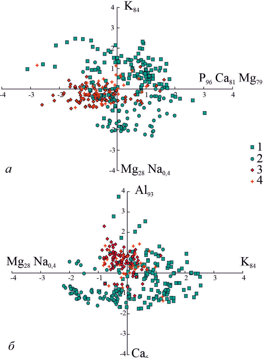 Графическое представление результатов факторного анализа позволило показать динамику изменчивости химического состава гидроксилапатита в зависимости от частей трубчатой кости и ее состояния (рис. 5). Область, соответствующая химическому составу гидроксилапатита здоровой кости, обширна и занимает три квадранта (рис. 5а). При этом фигуративные точки гидроксилапатита эпифиза и диафиза формируют отдельные поля, существенно отличаясь в составе примесных элементов. Для гидроксилапатита эпифиза присутствие K предпочтительнее, чем Na и Mg, в отличие от гидроксилапатита диафиза. Фигуративные точки состава гидроксилапатита пораженной остеопорозом кости группируются в «свободном» четвертом квадранте и образуют компактное поле анализов из диафиза и эпифиза. Очевидно, что в гидроксилапатите кости особи, пораженной остеопорозом, происходит замена видообразующих элементов примесными. Поле смещено в противоположную сторону от кальциевого фактора, что может указывать на некоторый дефицит этого элемента, который компенсируется Al, в меньшей степени Mg и Na, либо на изменение биохимии процесса при формировании минеральной фазы (рис. 5б).