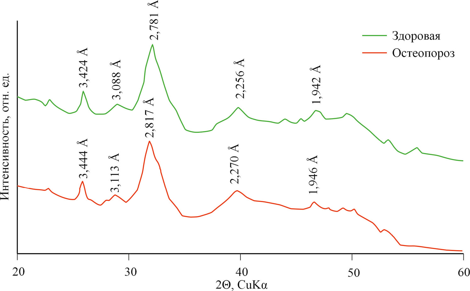 Рис. 6. Дифрактограммы гидроксилапатита здоровой и пораженной остеопорозом костной ткани.