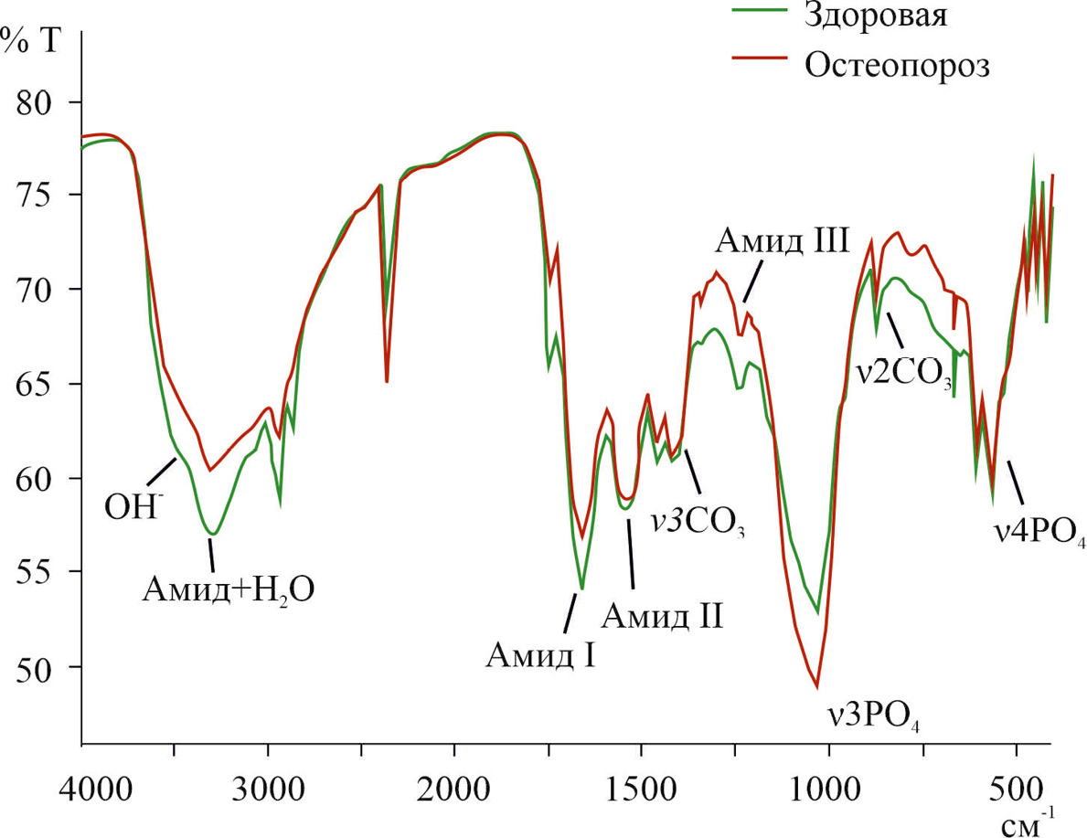 Рис. 7. ИК спектры гидроксилапатита здоровой и пораженной остеопорозом костной ткани.