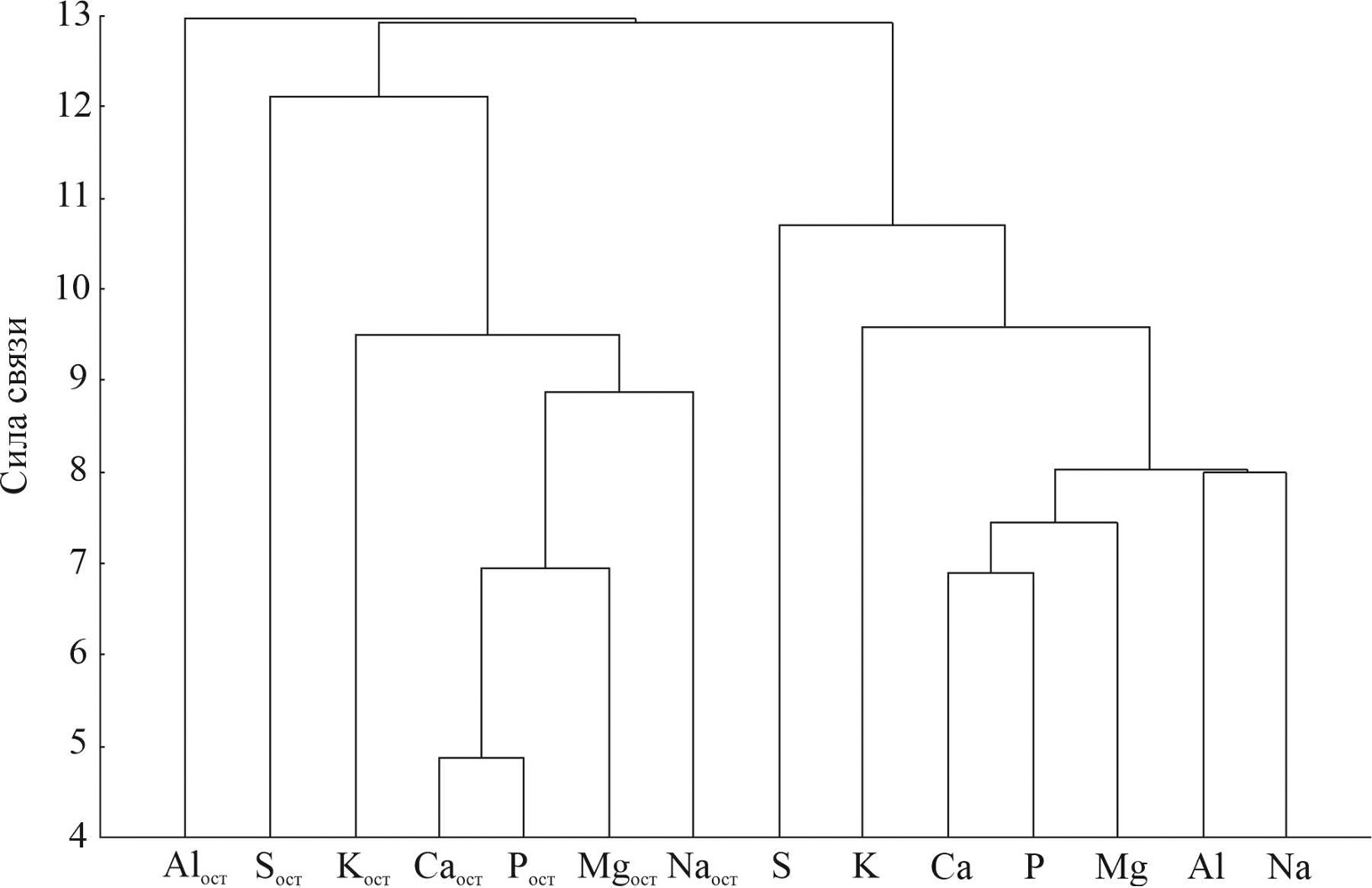 Менее очевидные зависимости содержаний элементов-примесей в гидроксилапатите костной ткани проанализированы с помощью кластерного и факторного анализов. Кластерный анализ выполнен иерархическим методом по алгоритму Варда (Ward, 1966). Поскольку при пробоподготовке использовали порошок SiC, частицы которого могли остаться в кости с признаками остеопороза, Si из выборки был исключен. Отдельно рассмотрены характер объединения элементов в группах по степени здоровья костной ткани и типу костной ткани. В результате обработки химических анализов гидроксилапатита костной ткани наблюдаются сходная группировка элементов в кластеры (рис. 4).