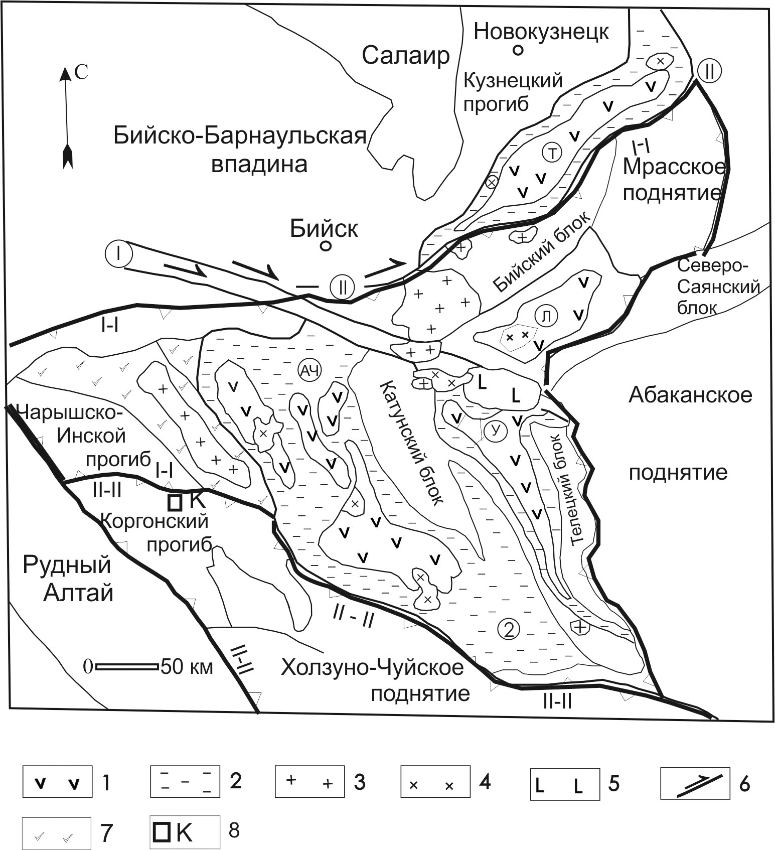 Troughs: Т – Telbes, АЧ – Anuy-Chuya, Л – Lebedskoy, У – Uimen. Deep faults: I – Biya, II – Telbes (branch of the Biya Fault), III – Charysch-Terekta; 8 – location of the Kumir area.
