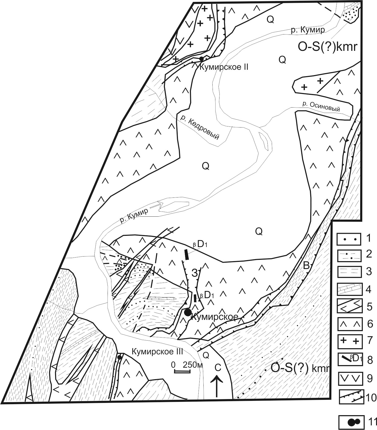 Рис. 2. Схематическая геологическая карта Кумирского рудного поля.