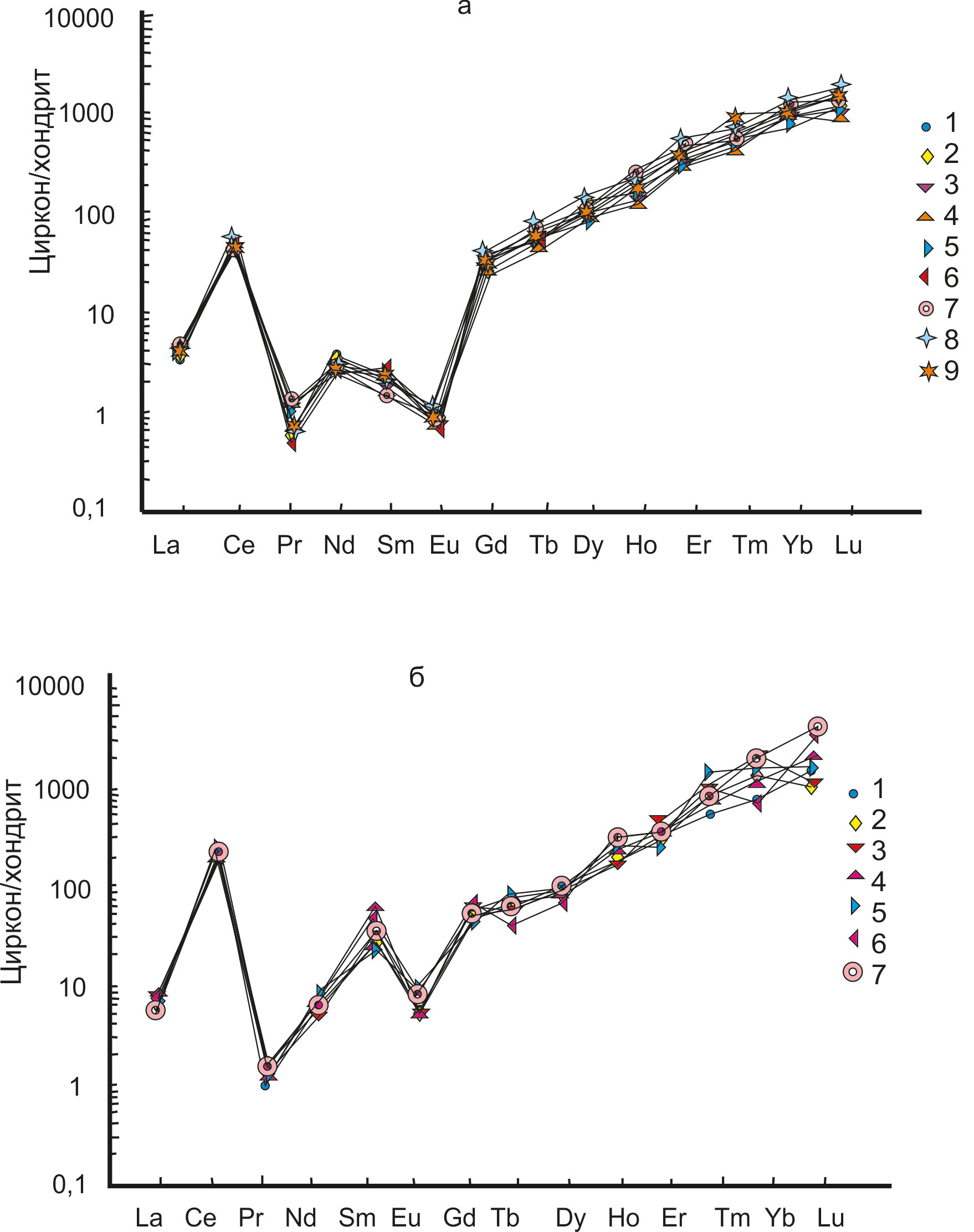 Рис. 3. Хондрит-нормализованные спектры распределения РЗЭ в магматогенном (а) и метамиктном (б) цирконах Кумирского штока.
