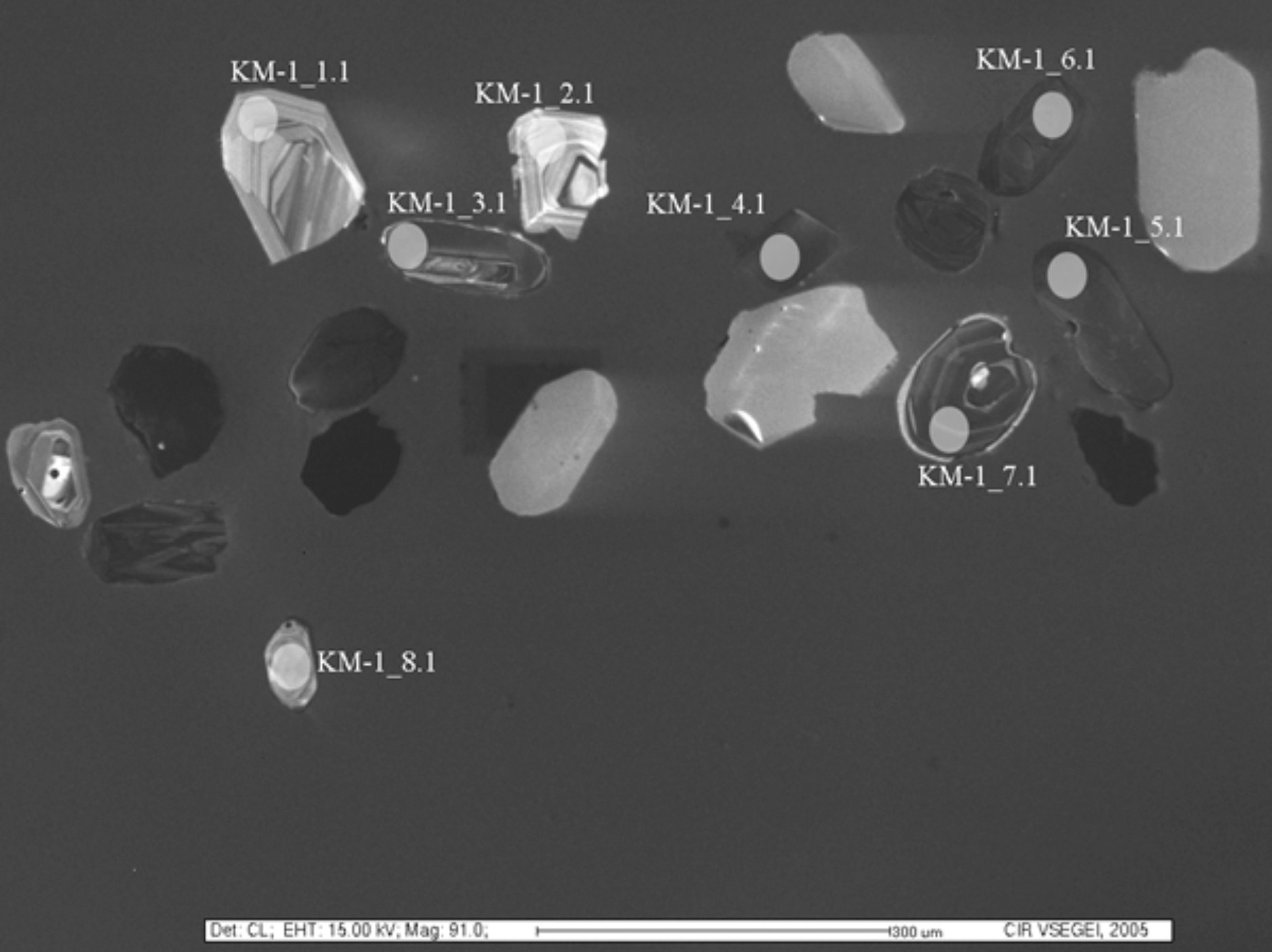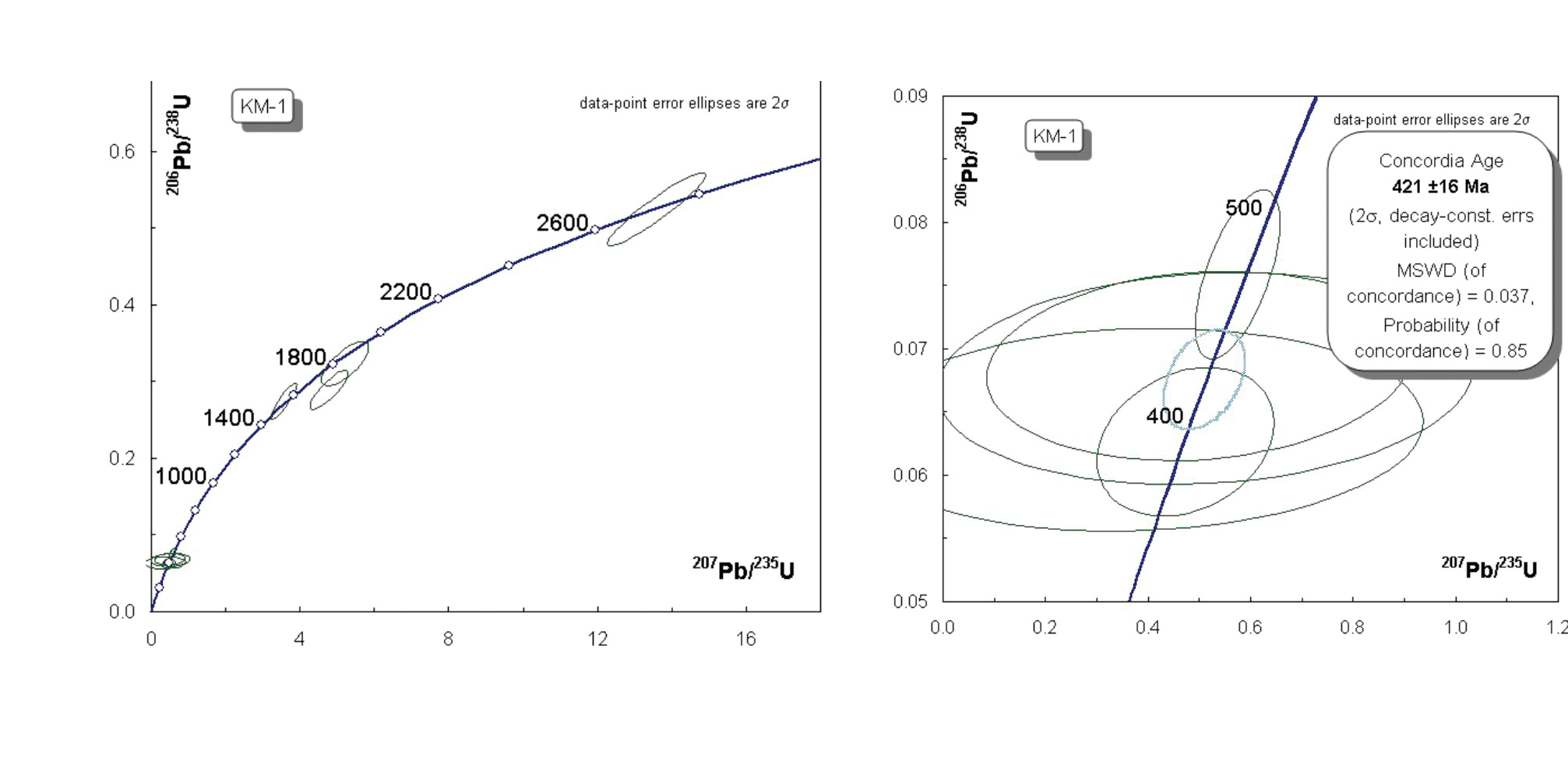 Возраст. Чистые зерна магматического циркона (точки КМ-1.1.1, 1.6.1, 1.7.1, 1.8.1, 1.9.1, рис. 5) показали конкордантный возраст 421 ± 16 млн лет (MSWD = 0.037, рис. 6).