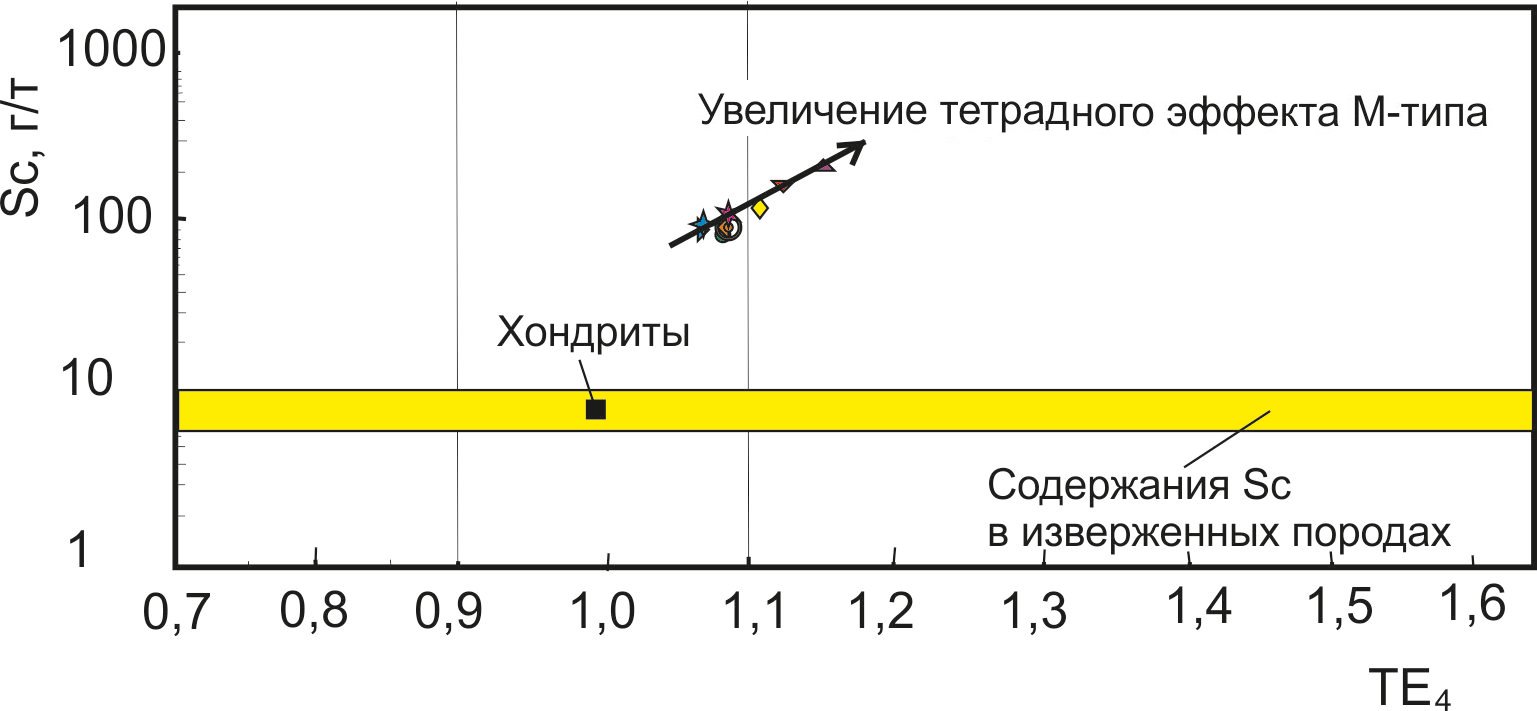 Note. Here and in Tables 2, 3, the contents of elements are normalized to chondrites СI (McDonough, Sun, 1995). Eu* = (SmN + GdN) / 2, normalized after (McDonough, Sun, 1995); ТЕ4 – tetrad effect of REE fractionation of the forth tetrad after (Irber, 1999).