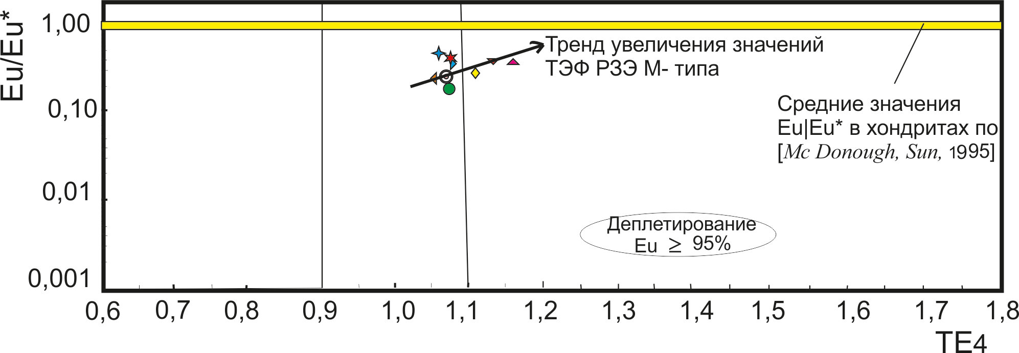 Рис. 8. Диаграмма Eu/Eu*–TE4 для магматогенного циркона Кумирского штока.