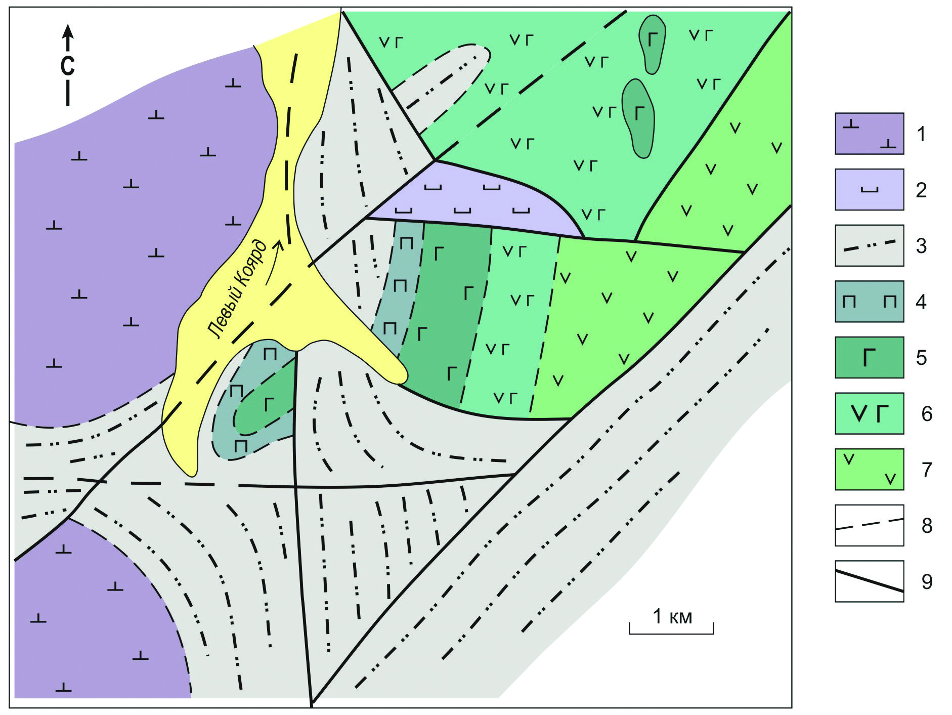 Fig. 2. Scheme of geological structure of the Kurtushiba ophiolites (Idzhim massif, area of the Levy Koyard River), composed by the authors.