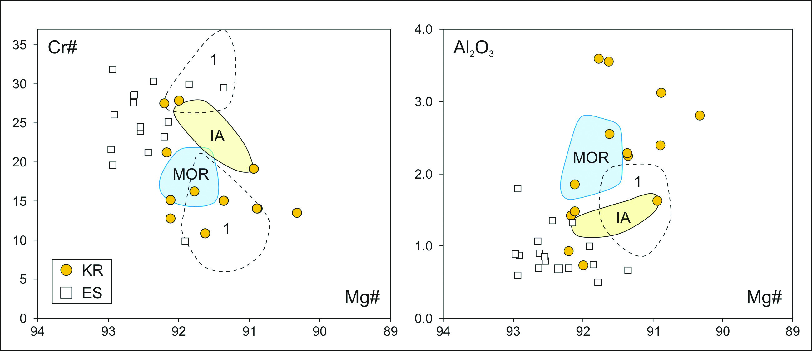 Ортопироксены на диаграммах Cr#–Mg# и Al2O3–Mg# разделяются на две группы. Пироксены с повышенной хромистостью и пониженным содержанием Al2O3 близки по составу к ортопироксенам из островодужных ультрабазитов. Другая группа пироксенов с минимальными значениями Cr# и максимумом содержания Al2O3 наиболее близка ортопироксенам гарцбургитов САХ. Подобное разделение отмечается и для ортопироксенов из гарцбургитов офиолитов Горного Алтая, при этом для пироксенов из офиолитов Восточного Саяна характерны исключительно островодужные характеристики (рис. 5).