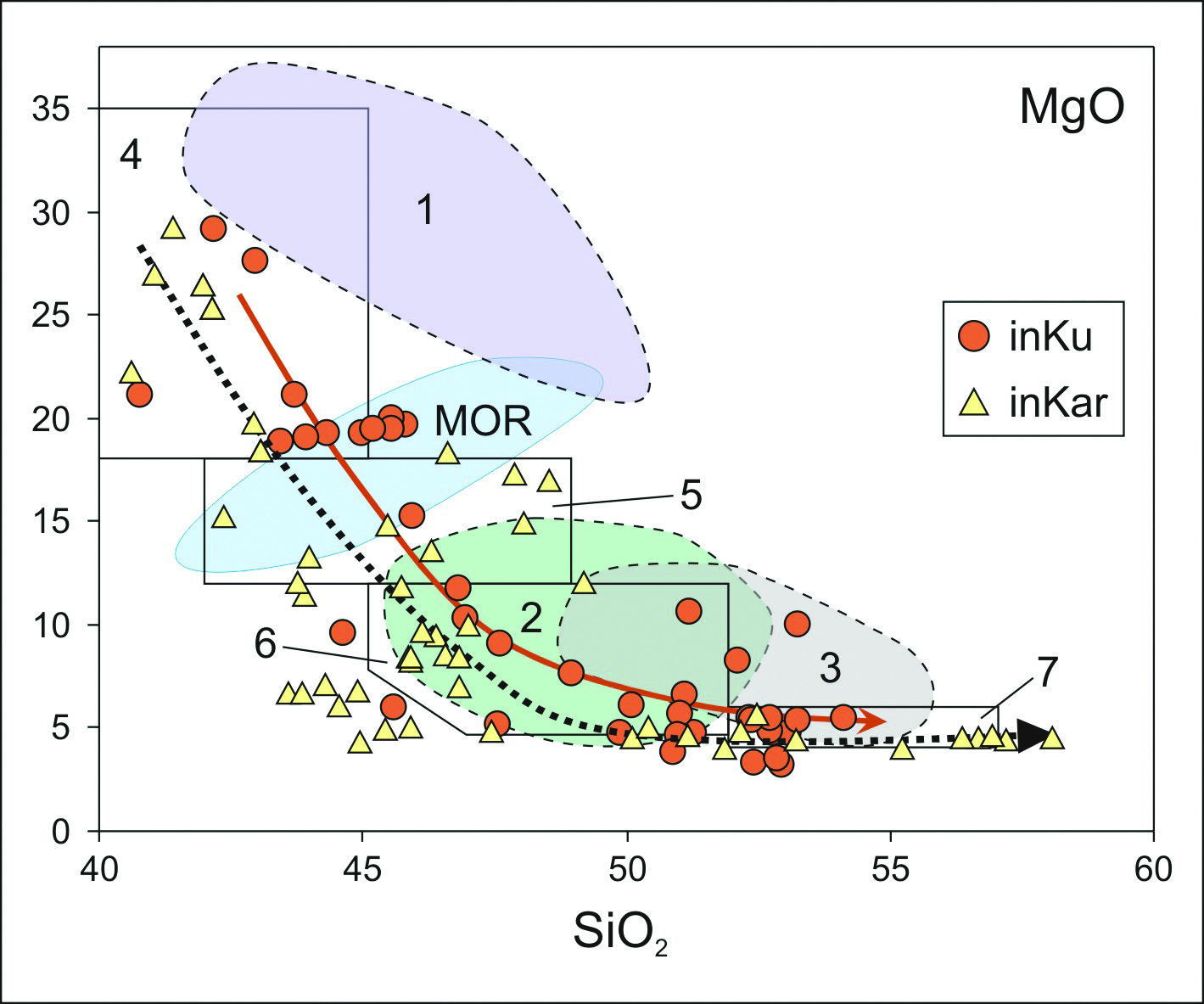 Fig. 8. Composition of melt inclusions in Cr-spinels from dunites of the Kurtushiba ophiolites (InKu) and Karashat massif (InKar) on MgO–SiO2 diagram. Based on original data and materials from (Petrology…, 1977; Igneous…, 1983; Petrographic…, 2009; Simonov et al., 2009).