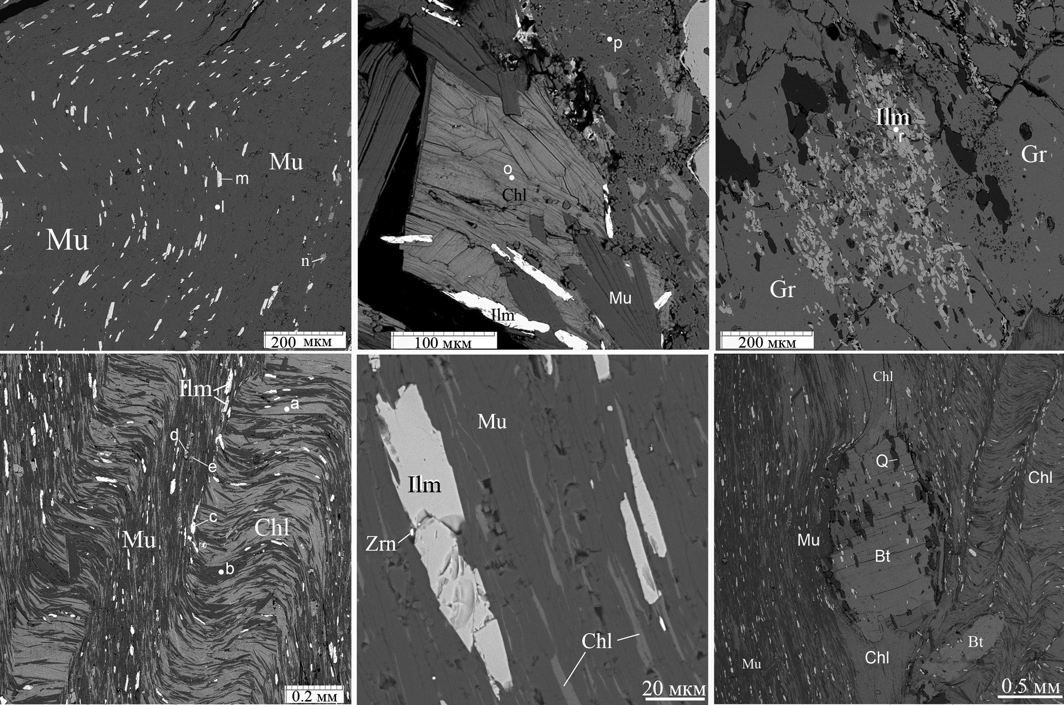 Хлорит (шамозит) (Fe3.35Mg1.25Al0.40)Al(Si2.49Al1.51)O10(OH)8 и мусковит K0.77Na0.14Mg0.02Fe0.12Al1.94(Si3.10Al0.90)O10(OH)2 образуют отдельные или совместные прослои в толще сланцев (рис. 7). Вместе с ними образовались второстепенные ильменит Fe0.99Mn0.01Ta0.003 TiO3, эпидот Ca1.97Mn0.02Ti0.01(Al2.30Fe0.7)(Si3O12)(OH) и акцессорный фторапатит Ca4.96Fe0.04(PO4)3(F0.64OH0.36) (рис. 6, 7).