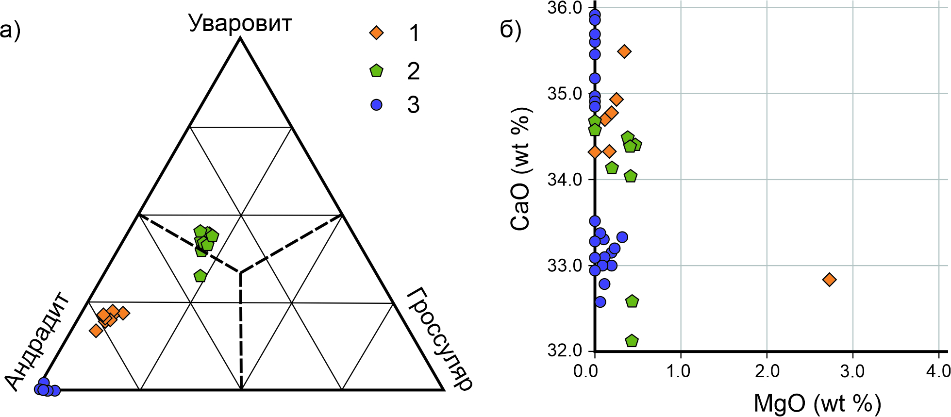 Гранаты в миаролитовых дунитах (рис. 7, 8а) по химическому составу соответствуют хромистому андрадиту со средним содержанием андрадитового минала 70 % (содержание Fe2O3 20.3–24.9 мас. %, табл. 1). Содержание уваритового и гроссулярового минала, в среднем, составляет 20 и 7 %, соответственно. Содержание CaO колеблется от 32 до 36 мас. %, в среднем ~34 мас. %. Оксиды Ti и Mg являются второстепенными в составе гранатов, однако отмечаются несколько индивидов с повышенным содержанием MgO до 2.7 мас. % (рис. 8б). Андрадит из миаролитовых дунитов не обладает отчетливой зональностью по химическому составу и характеризуется однородным строением.
