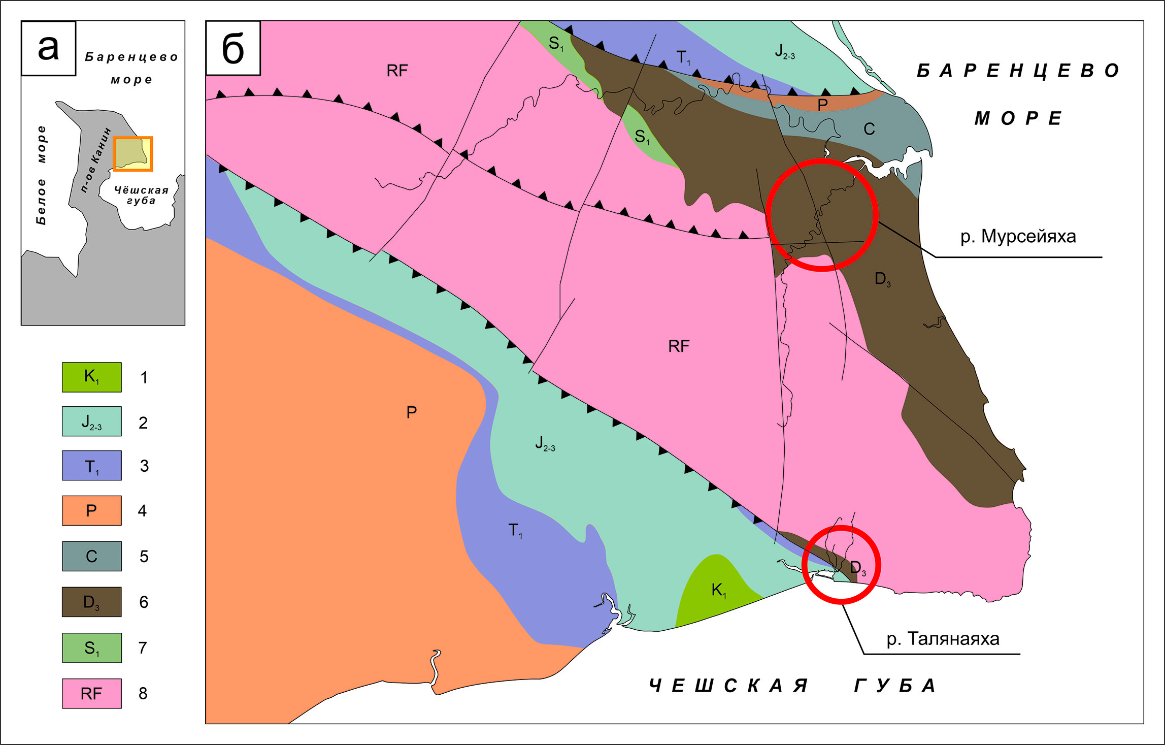 Fig. 1. Scheme of geological structure of the southeastern part of the Kanin Peninsula, modified after (Gornostai et al., 1984; Cheremkhina, 1996). Circles highlight the working areas, where the section of the Tayaokuyakha Formation is the most complete. 1 – Lower Cretaceous, terrigenous rocks; 2 – Middle and Upper Jurassic, terrigenous rocks; 3 – Lower Triassic, terrigenous rocks; 4 – Permian, mainly limestone; 5 – Carboniferous, mainly limestone; 6 – Upper Devonian, Frasnian Stage, basalt, terrigenous rocks; 7 – Lower Silurian, limestone; 8 – Riphean, Tarkhanov and Tabuev groups, metamorphic schist and quartzite sandstone.