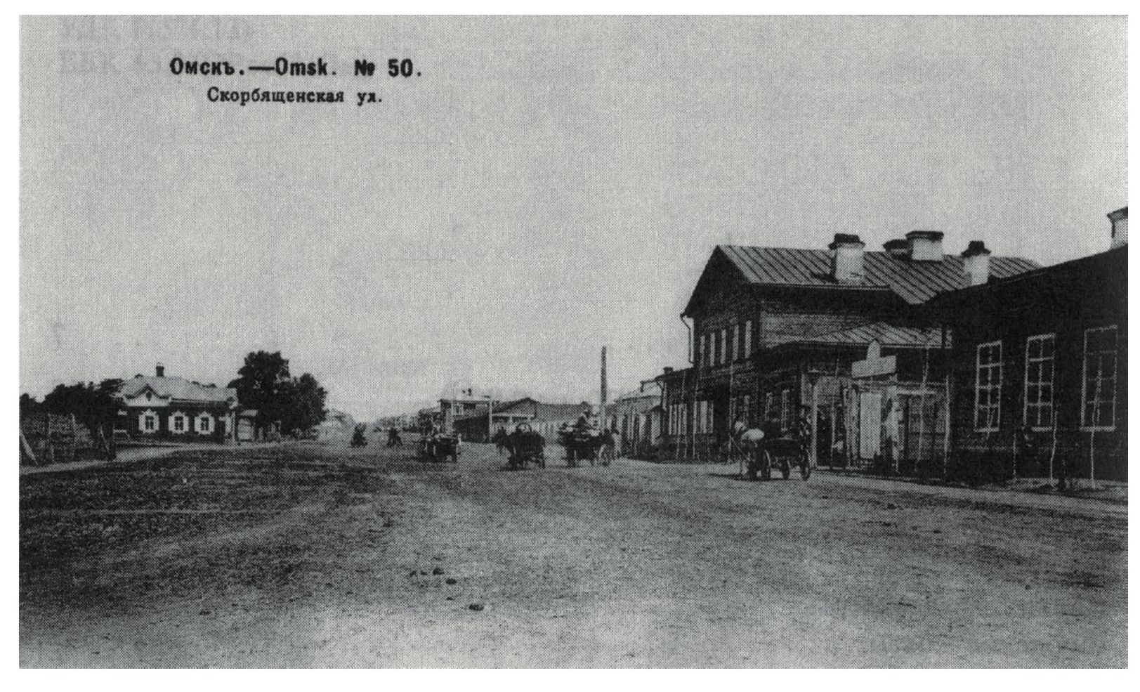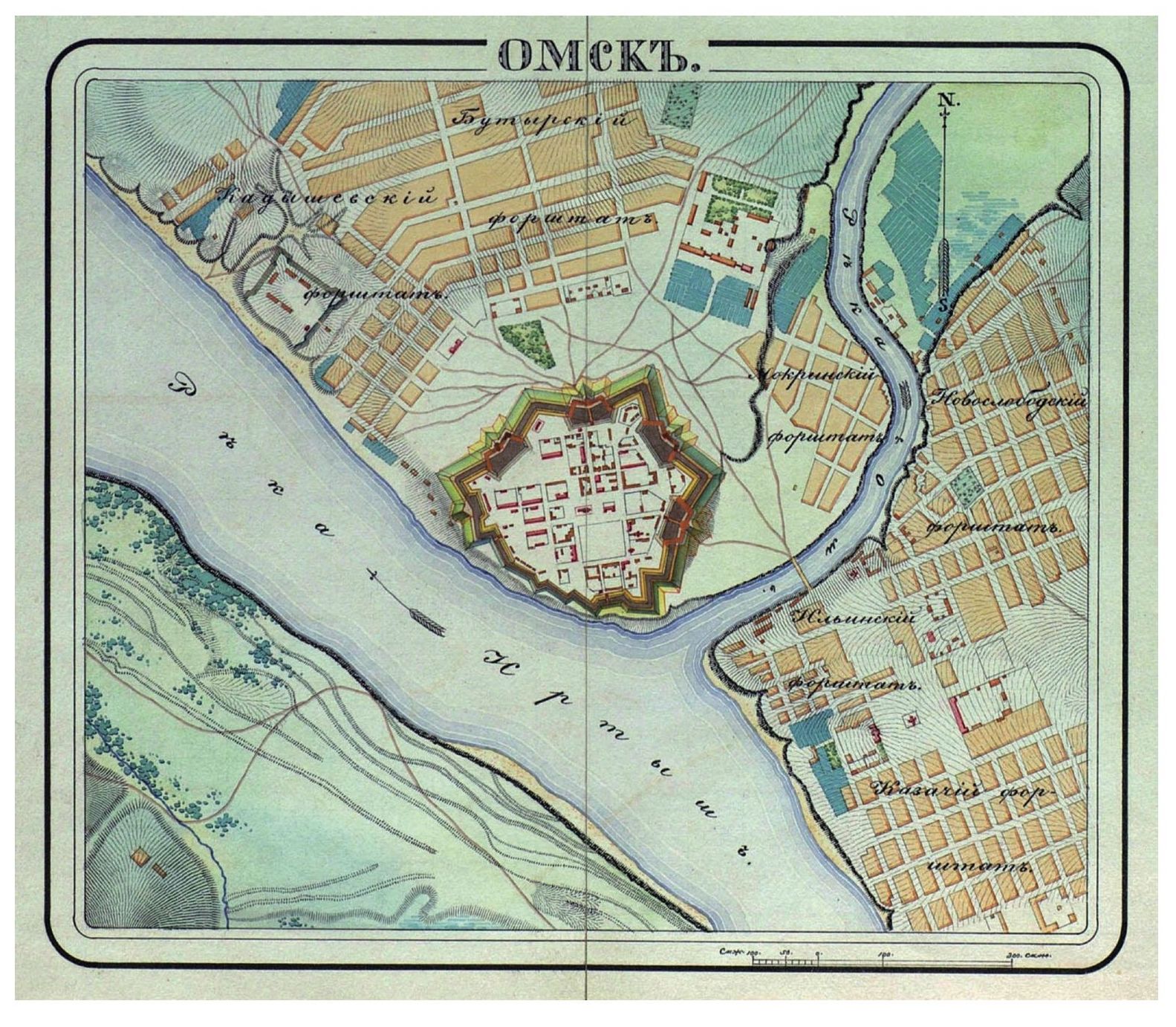 «Центръ крѣпости занимала большая площадь, на которой въ недальнемъ отъ Тарскихъ воротъ разстояніи высился массивный, православный крѣпостной соборъ съ церковнослужительскимъ домомъ, а по краямъ площади красовались равнявшіяся чинно и стройно въ шеренги каре различныя казенныя зданія обычной старинной казарменной архитектуры. Тутъ были: генералъ-губернаторскій дворецъ, комендантское управленіе, инженерное управленіе, корпусный штабъ, дома, гдѣ помѣщались начальства сказанныхъ управленій и служащій персоналъ съ семьями, а сзади ихъ — казармы 4, 5 и 6-го линейныхъ баталіоновъ и знаменитый омскій каторжный острогъ. Всѣ эти постройки, за исключеніемъ двухъэтажнаго корпуснаго штаба и баталіонныхъ казармъ, были одноэтажныя <…>. На форштадтахъ, или въ такъ называемомъ городѣ, тоже преобладалъ военный элементъ, но преимущественно — служебный или казачиій. За рѣчкой Омью располагалось управленіе наказнаго атамана, казачьи полки и батареи, кадетскій корпусъ съ особымъ домомъ для директора, дворянское собраніе, казенная суконная фабрика, на которой работали каторжные гражданскаго вѣдомства, и домъ откупщика, который, какъ извѣстно, въ то время былъ персоной grata. За городскимъ садомъ находились присутственныя мѣста, провіантское вѣдомство, военный госпиталь, гражданскій острогъ и при немъ больница. Но были и частные дома, гостиный дворъ, лавки, трактиры, магазины и солдатскія слободки на окраинахъ» [Мартьянов: 246–247].