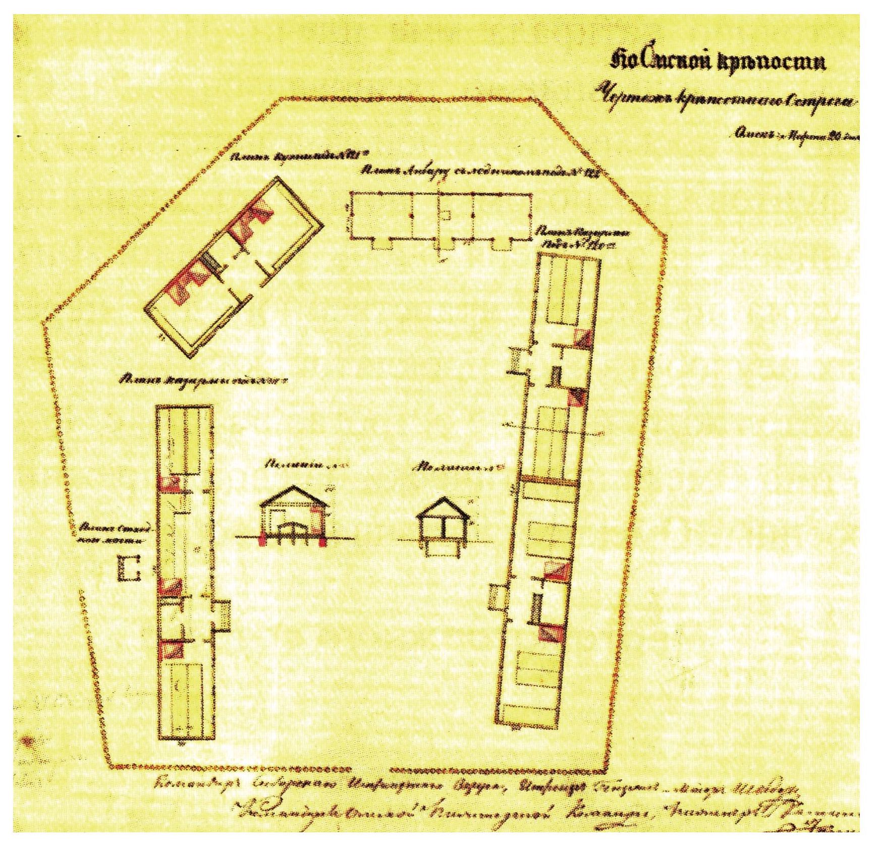 Fig. 9 . The drawing of the fortress of prison (ostrog) made after the Omsk fortress on March 20, 1847. The author is a drawer of the 2nd class Ershov