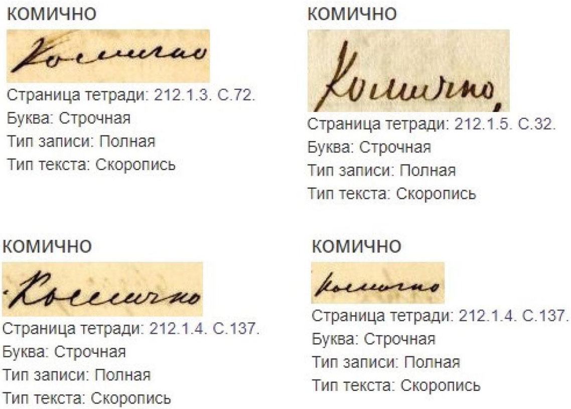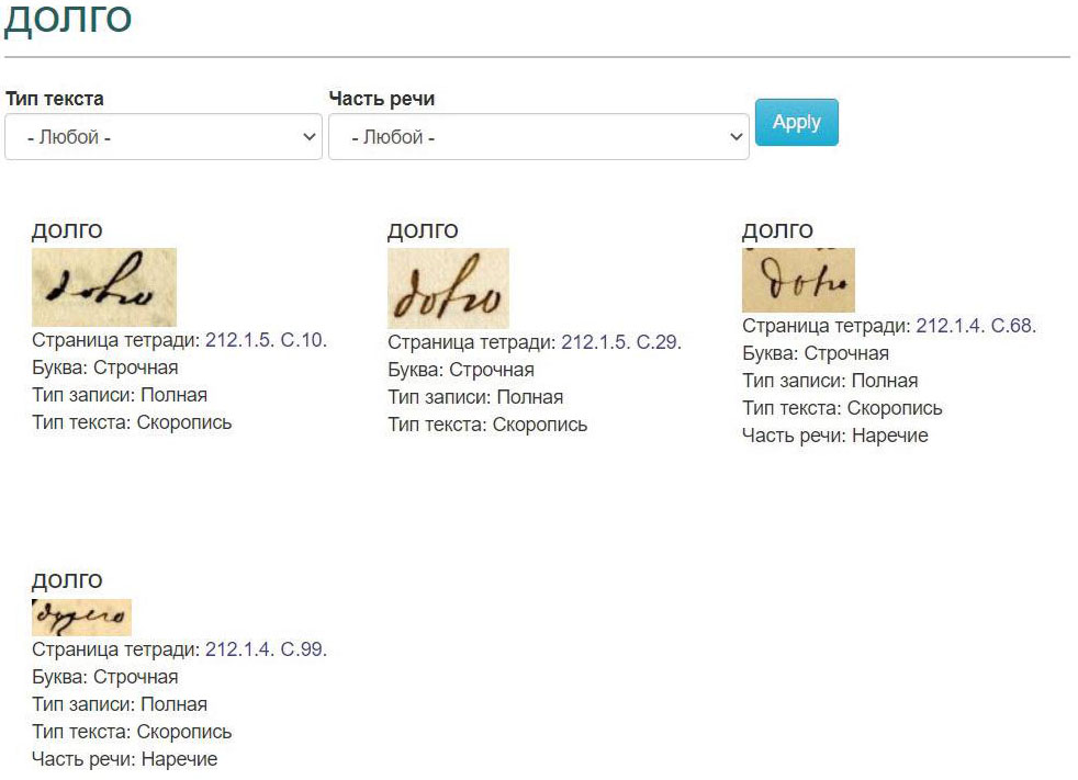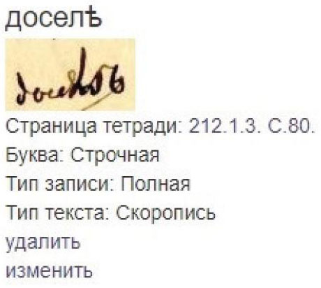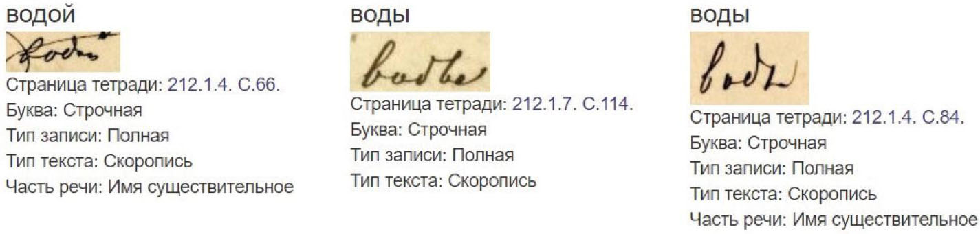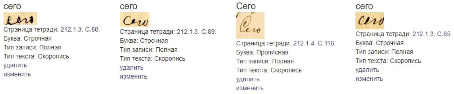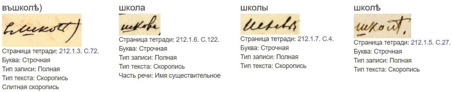 Список проанализированных графем отражается в Библиотеке графических образцов, где через поисковую строку можно найти образец почерка, набрав слово по первым буквам или полностью (см. Илл. 1). Примеры включают словоформы (при их наличии), что дает наглядную картину различных написаний одного и того же слова в одной или разных грамматических позициях, со строчной буквы и с прописной, карандашом или пером (чернилами).