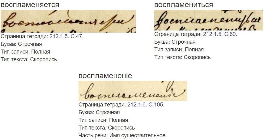 Fig. 39. The word “воспламененiе” and verb forms