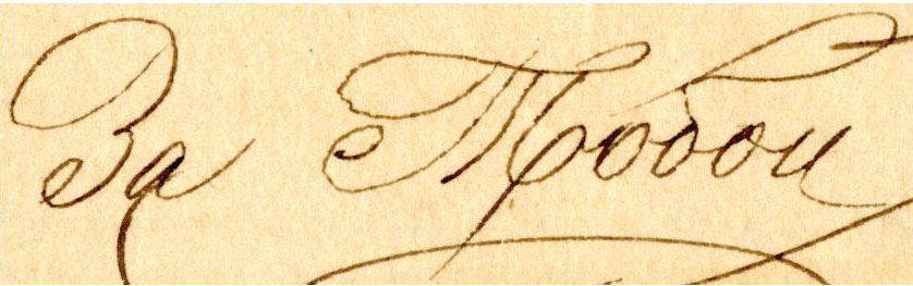Начертание заглавной буквы «Т» в этой каллиграфической записи сопровождается характерной петлей (или завитком) со штрихом, продолженным вниз, в завершающем элементе буквы. В каллиграфических записях Достоевского этот экспрессивный элемент встречается не однажды, причем так же, как и в данном случае, не только при изолированном написании заглавной буквы, но и в составе слова. (Кстати, подобное начертание можно найти и в учебных прописях эпохи Достоевского.) Однако не только в первой публикации этой каллиграфической записи (см.: [Баршт: 39, № 31]), но и в новейшем академическом Полном собрании сочинений писателя запись «За Тобой» ошибочно прочтена как «За Пробой» (нижняя экспрессивная петля в завершающей части буквы «Т» воспринята текстологами как самостоятельная строчная буква «р»). Причем в последнем случае публикатор в примечаниях даже предпринимает попытку связать эту каллиграфическую запись с окружающим контекстом творческих набросков к «Преступлению и наказанию», в частности вспомнив «пробу», на которую в начале романа идет Родион Раскольников (см.: [Д35; т. 7: 172, 777]).