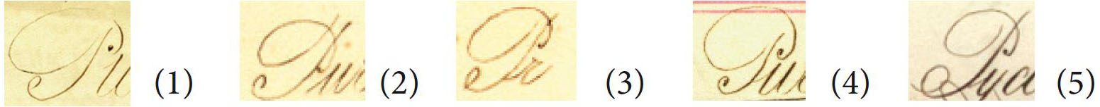 The capital letter “Р” in the cursive workbooks in the 1830–1850s (1, 2) and in 1854 Dostoevsky’s manuscript (3, 4, 5)