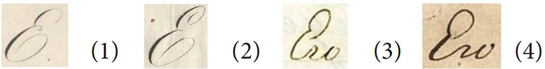 The capital letter “E” in the cursive workbooks (1, 2), in 1854 Dostoevsky’s manuscript (3) and in the 1857 report (4)