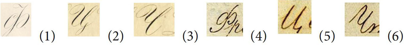 Начну с одного — хотя и периферийного, но, как представляется, значимого — наблюдения. Выше уже было отмечено, что в рукописи 1854 начертание целого ряда букв вариативно. В качестве примера приведу прописную букву «У», которая в тексте первой «сибирской оды» встречается трижды. В двух случаях ее написание лишено индивидуальных примет, типично для почерков, которые ставились в учебных заведениях эпохи Достоевского (для сравнения приведу вариант написания из учебных прописей 1830–1850-х гг.).
