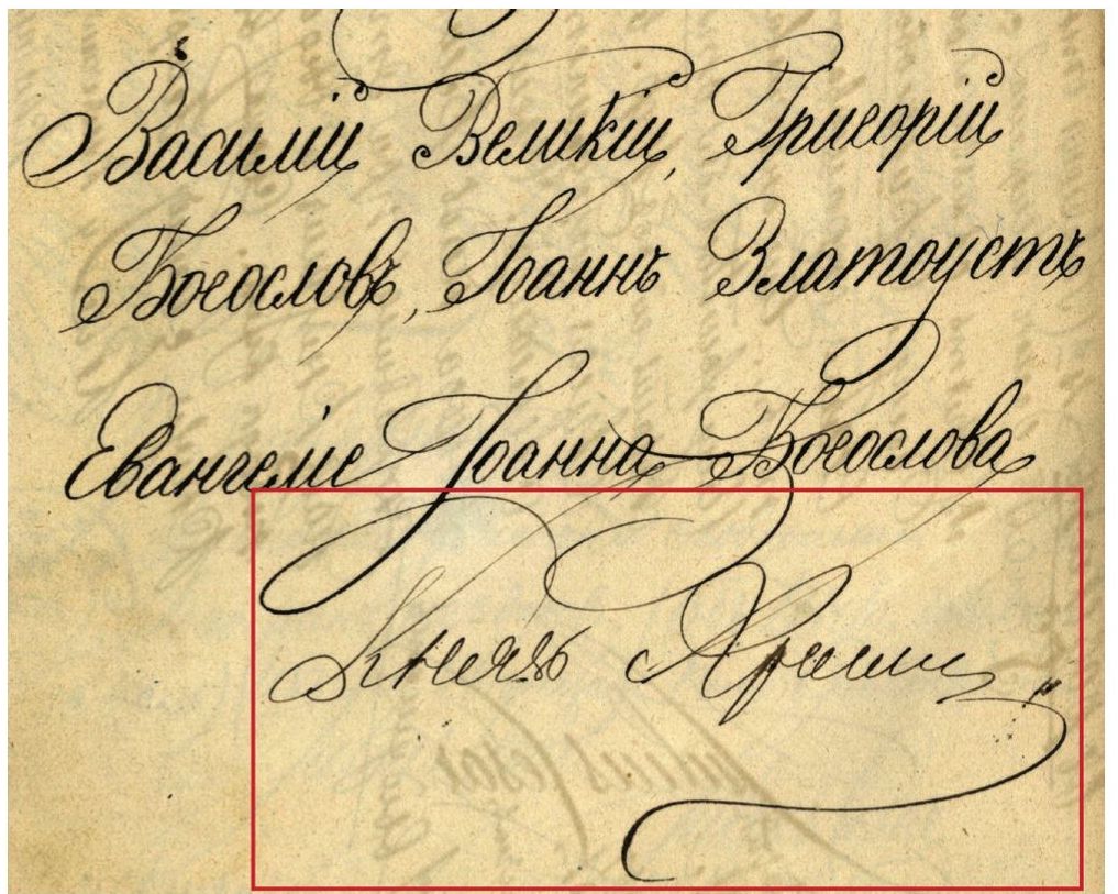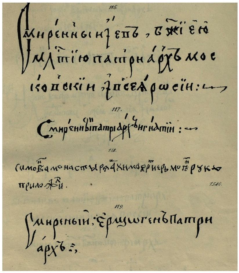 Как установили комментаторы Д30, Достоевский дает здесь отсылку к «погодинскому изданию» с образцами средневековых почерков: имеется в виду изданный М. П. Погодиным «альбом "Образцы славяно-русского древлеписания", тетради 1–2 (М., 1840–1841)», в котором «представлены 44 образца рукописных шрифтов (с IX по XVIII в.)», литографированных художником К. Я. Тромониным (см.: Д30; т. 9: 431, примеч. Н. Н. Соломиной). Г. Н. Крапивин дополнил эту информацию, уточнив, что было и другое издание: «Русский исторический альбом» (М., 1853), где встречаются подписи церковных деятелей с использованием слов «смиренный» и «руку приложил» (например, в образцах № 115, 116, 117 и 118) [Крапивин: 149] (см. Илл. 2–3).