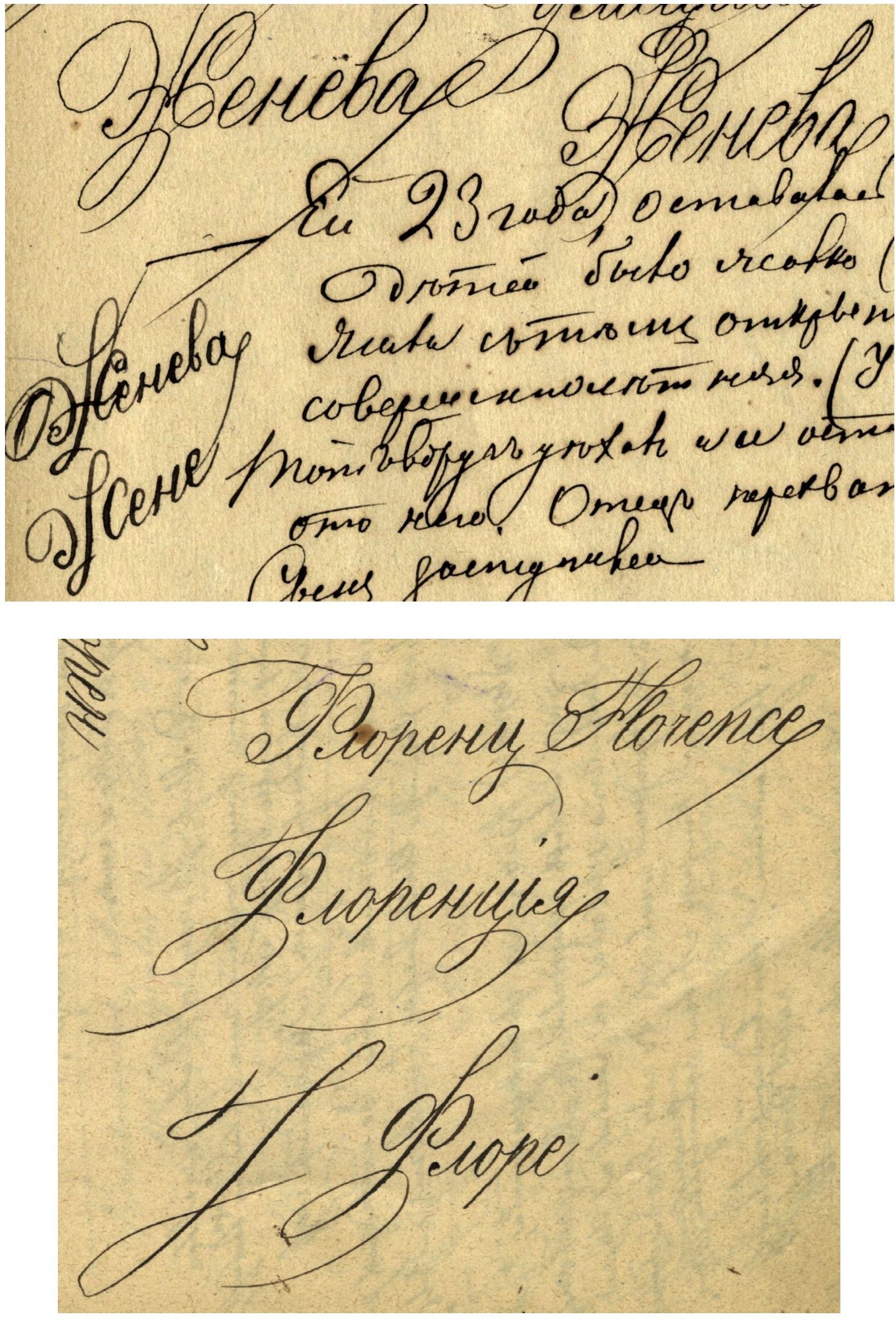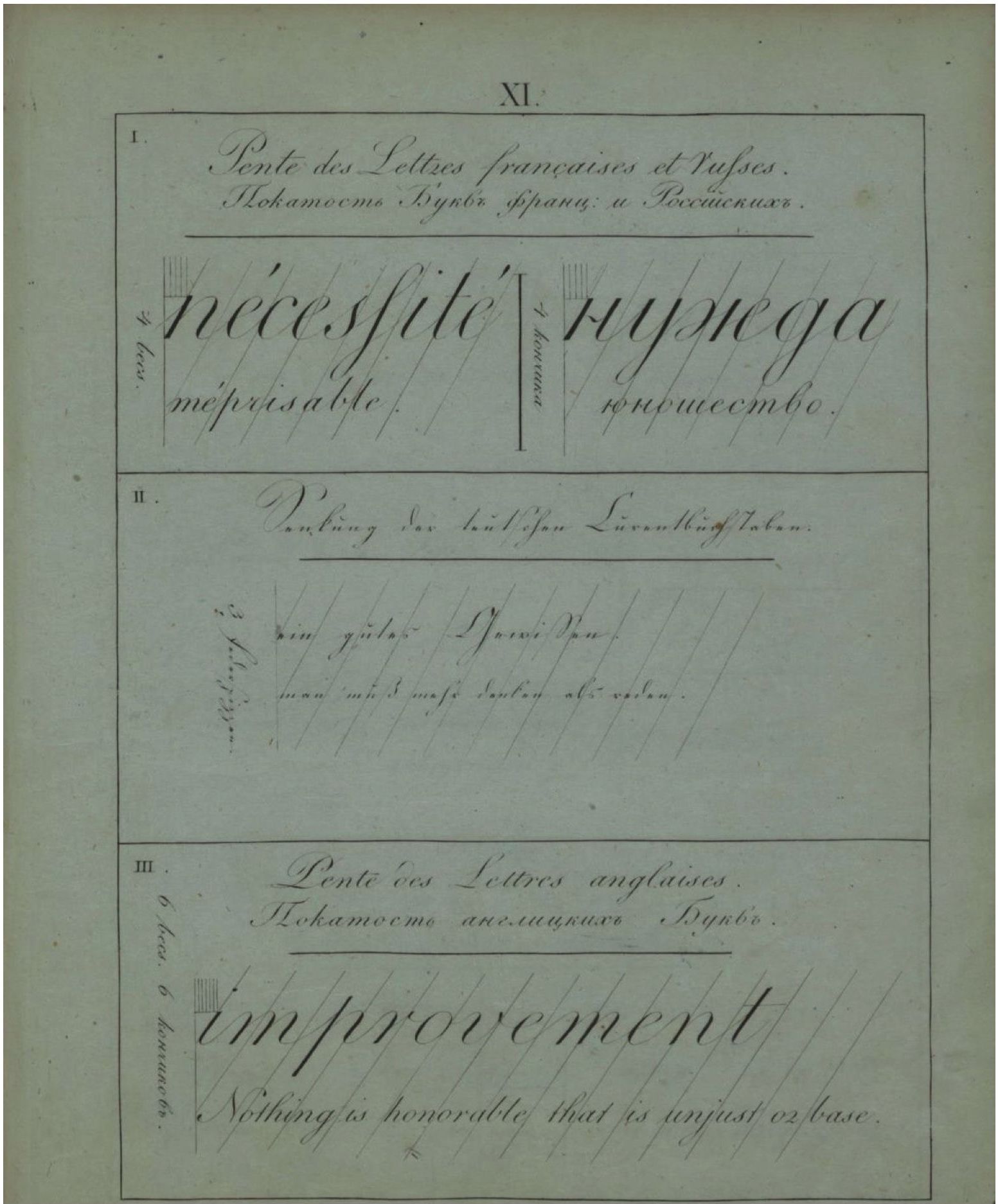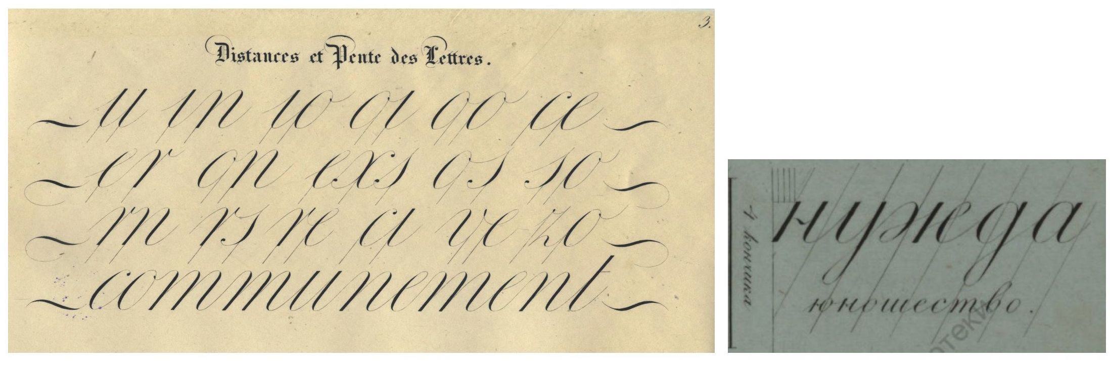 Ср. с одной из попыток «перевести французский характер в русские буквы» в руководстве по чистописанию, выпущенном в конце этого же столетия:
