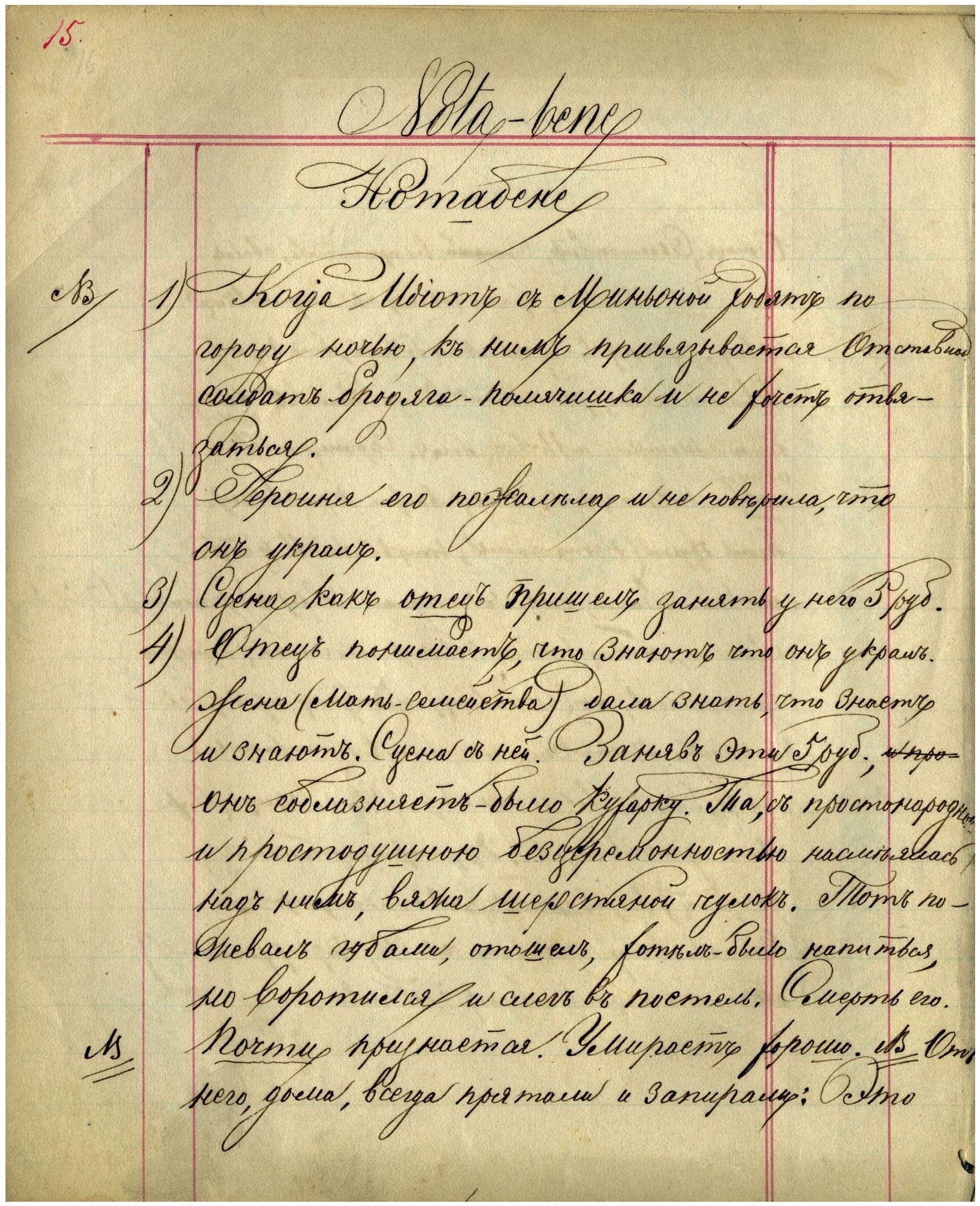 «Потом я вот тут написал другим шрифтом: это круглый, крупный французский шрифт, прошлого столетия, иные буквы даже иначе писались, шрифт площадной, шрифт публичных писцов, заимствованный с их образчиков (у меня был один), — согласитесь сами, что он не без достоинств. Взгляните на эти круглые д, а. Я перевел французский характер в русские буквы, что очень трудно, а вышло удачно» (Д35: 32).