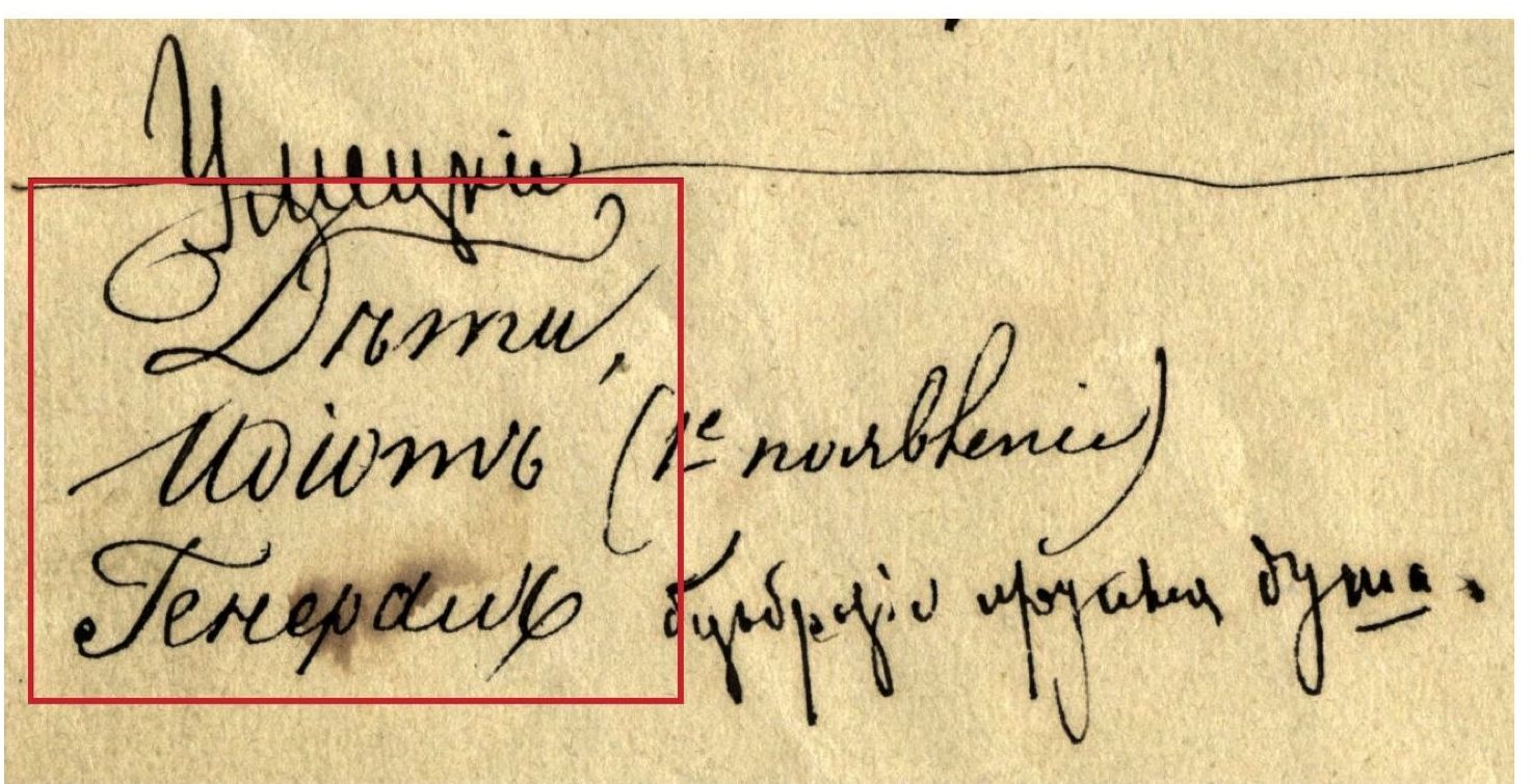 Почерк определяется как «письмо с индивидуальной манерой изображения отдельных букв и их связей между собой» [Рейсер, 1982: 59], «совокупность индивидуальных особенностей письма того или иного человека, объективно проявившихся в конкретном тексте. Сюда входят: графика букв, строчные и надстрочные знаки, манера сокращения слов, а также общий вид текста — расположение письма на листе (плотность написания букв, особенности строки, ее совершенство и т. п.)» [Лёвочкин: 125], рассматривается в контексте понимания «письма как деятельности, как формы социального поведения, своего рода письменного (графического) поведения4 пишущего (связанного с его социальным статусом и с его социальной ролью)» [Цыпкин: 846–847]. По утверждению Д. О. Цыпкина, «применительно к историческому русскому письму у нас существует достаточно убедительных примеров, показывающих, что индивидуальное письмо не просто являлось формой социального поведения, но и осознавалось в таком качестве самими пишущими» [Цыпкин: 848] — в качестве примера исследователь приводит диалог князя Мышкина с генералом Епанчиным из романа «Идиот», где речь заходит о каллиграфии [Цыпкин: 849] (см.: Д35: 32).