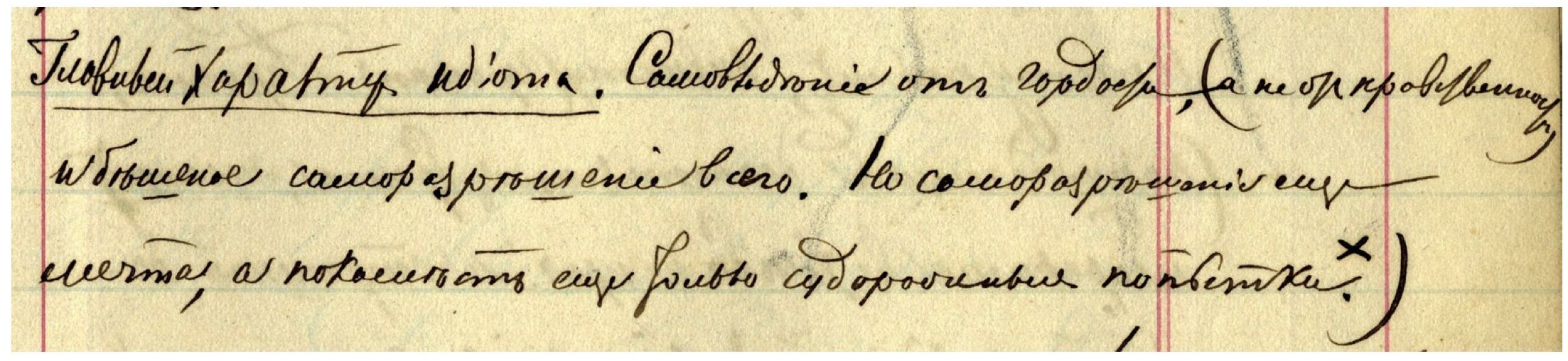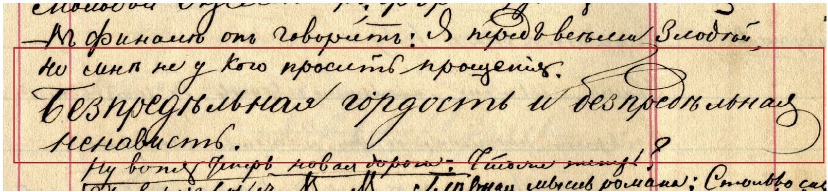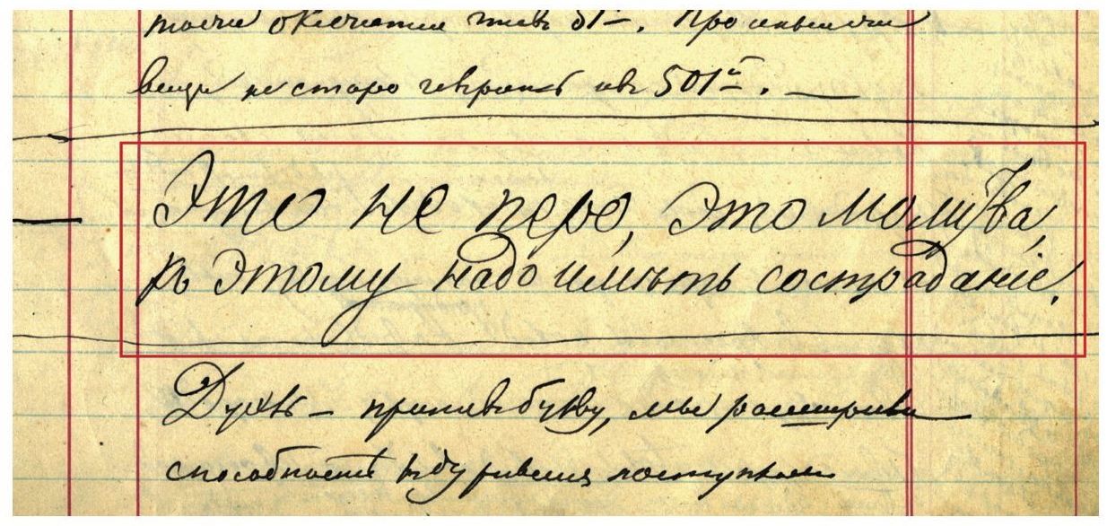 «Вот и еще прекрасный и оригинальный шрифт, вот эта фраза: "Усердие всё превозмогает". Это шрифт русский, писарский или, если хотите, военно-писарский. Так пишется казенная бумага к важному лицу, тоже круглый шрифт, славный, черный шрифт, черно написано, но с замечательным вкусом. Каллиграф не допустил бы этих росчерков или, лучше сказать, этих попыток расчеркнуться, вот этих недоконченных полухвостиков, — замечаете, — а в целом, посмотрите, оно составляет ведь характер, и, право, вся тут военно-писарская душа проглянула: разгуляться бы и хотелось, и талант просится, да воротник военный туго на крючок стянут, дисциплина и в почерке вышла, прелесть!» (Д35: 32).