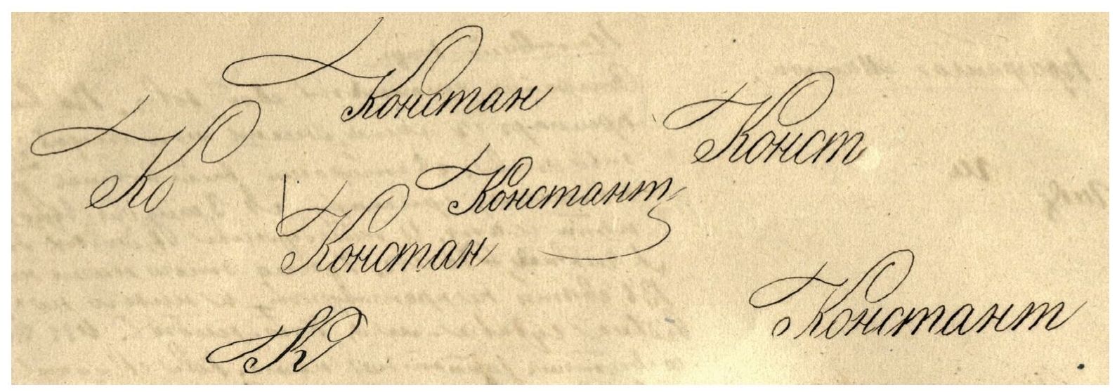 В романном диалоге, хорошо знакомом читателям, звучат несколько определений, свидетельствующих о том, что Достоевский имел представление и о древнем письме, и о скорописи Нового времени, в том числе в каллиграфических ее примерах. Говоря о «каллиграфических этюдах» писателя, следует учитывать, что образцы каллиграфии были известны ему и как выпускнику Главного инженерного училища: Достоевский блестяще владел навыками каллиграфического письма (см.: [Тихомиров: 42]).