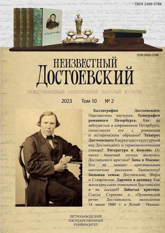 - Prokhorov G. S. The Case of Mikhail Andreevich Dostoevsky’s Death, or What Did Judges Sweat Away During a Year and a Half. In: Neizvestnyy Dostoevskiy [The Unknown Dostoevsky], 2017, vol. 4, no. 2, pp. 3–22. Available at: https://unknown-dostoevsky.ru/files/redaktor_ pdf/1499857476.pdf (accessed on April 15, 2023). doi: 10.15393/j10.art.2017.3161 (In Russ.)