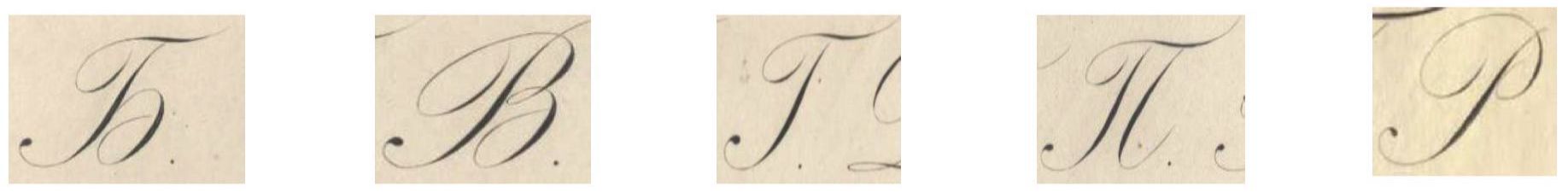 Fig. 6. Capital letters “Б”, “В”, “Г”, “П”, “Р” in Dostoevsky’s manuscript of 1856